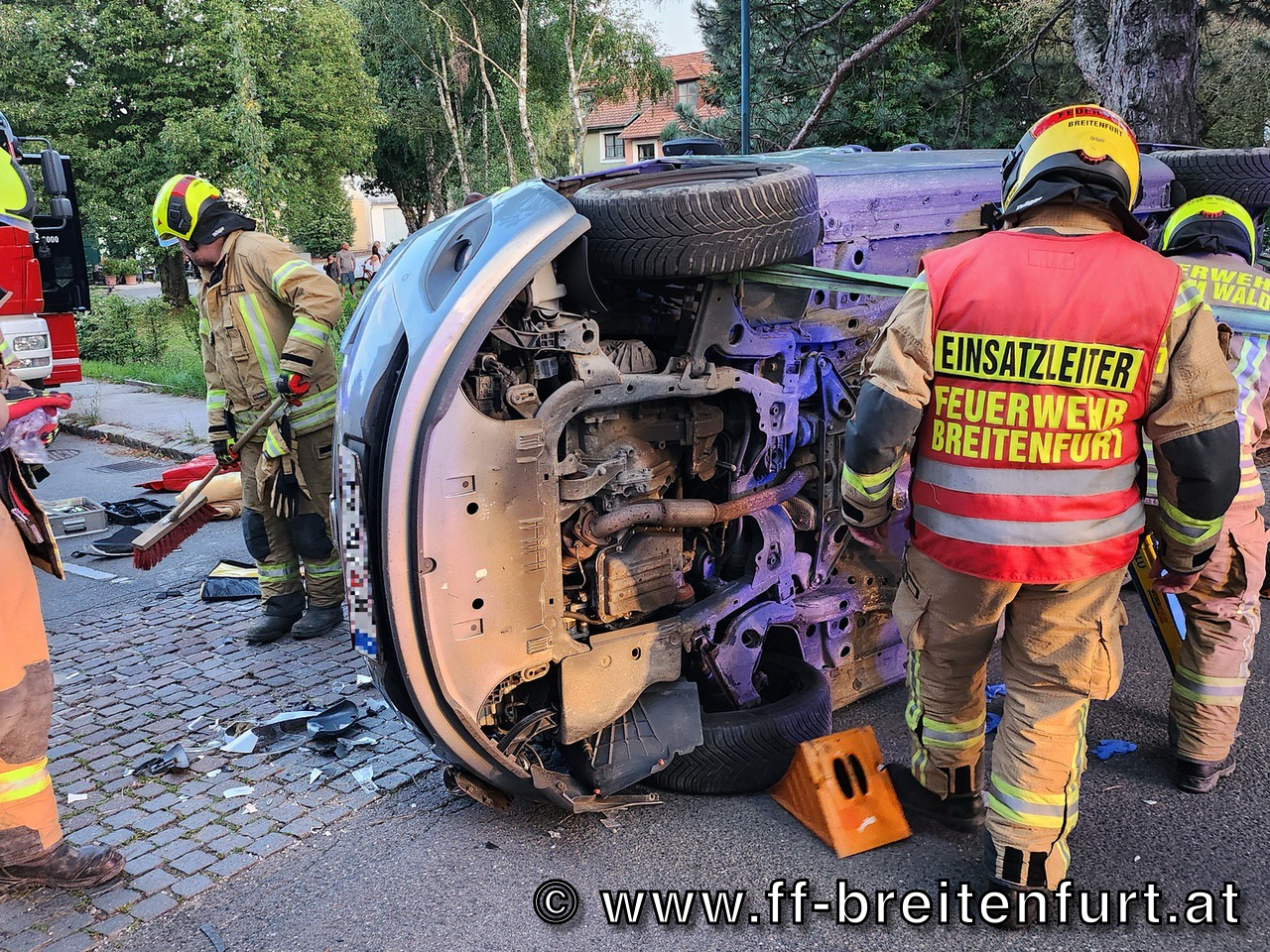 Ein Fahrzeug hatte ein geparktes Auto touchiert und kam auf den Beifahrersitzen zum Liegen. Die Lenkerin befand sich im Fahrzeug eingeschlossen und kam ebenfalls auf dem Beifahrersitz zu liegen.
