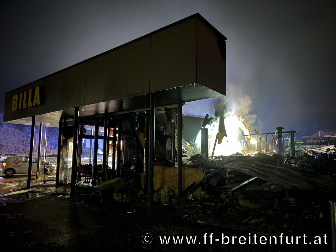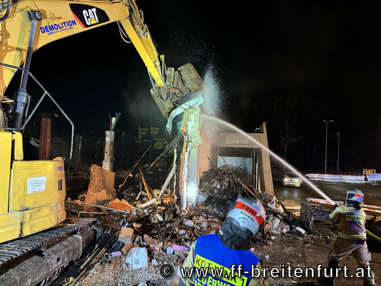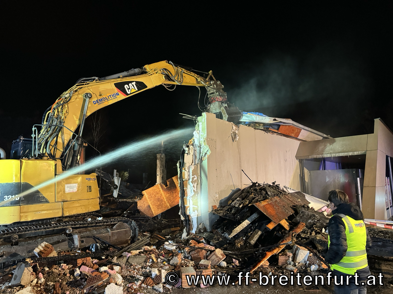 Am Mittwoch, dem 17. Jänner 2024, wurde die Freiwillige Feuerwehr Breitenfurt zur bereits ausgebrannten BILLA-Filiale gerufen. Infolge verbliebener Glutnester kam es im Dachbereich sowie in der noch stehenden Wand erneut zu einer starken Rauchentwicklung. Mittels Bagger der Firma Demolition wurde das Dach abgetragen, die Glutnester wurden mit einem C-Rohr abgelöscht und die betroffenen Bereiche mittels Wärmebildkamera kontrolliert.