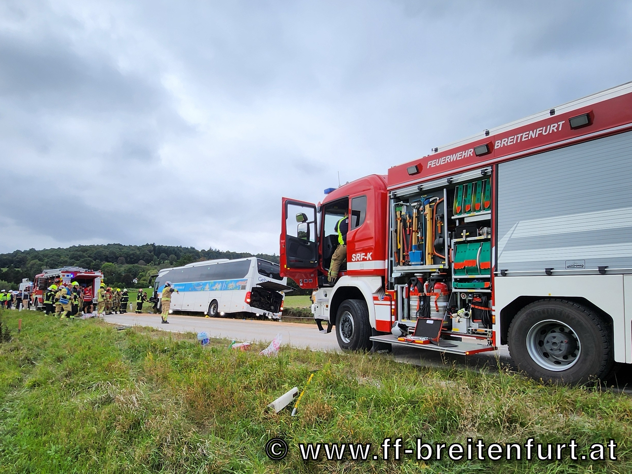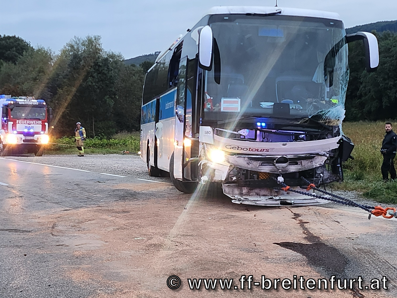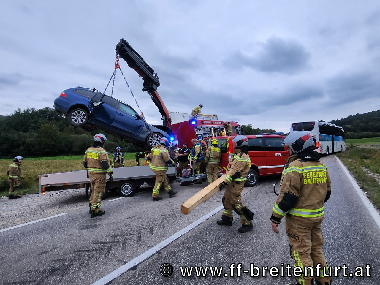 Der Reisebus wurde mit der Seilwinde des SRF und des RLF geborgen, gesichert auf der Fahrbahn abgestellt und anschließend abtransportiert. Das verunfallte Fahrzeug konnte mit dem Kran des SRF geborgen und von den Kameraden der FF Laab im Walde abtransportiert werden.