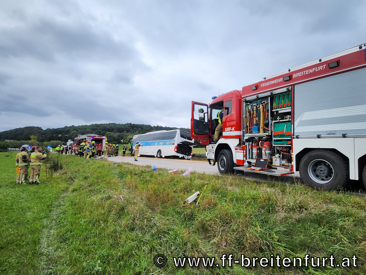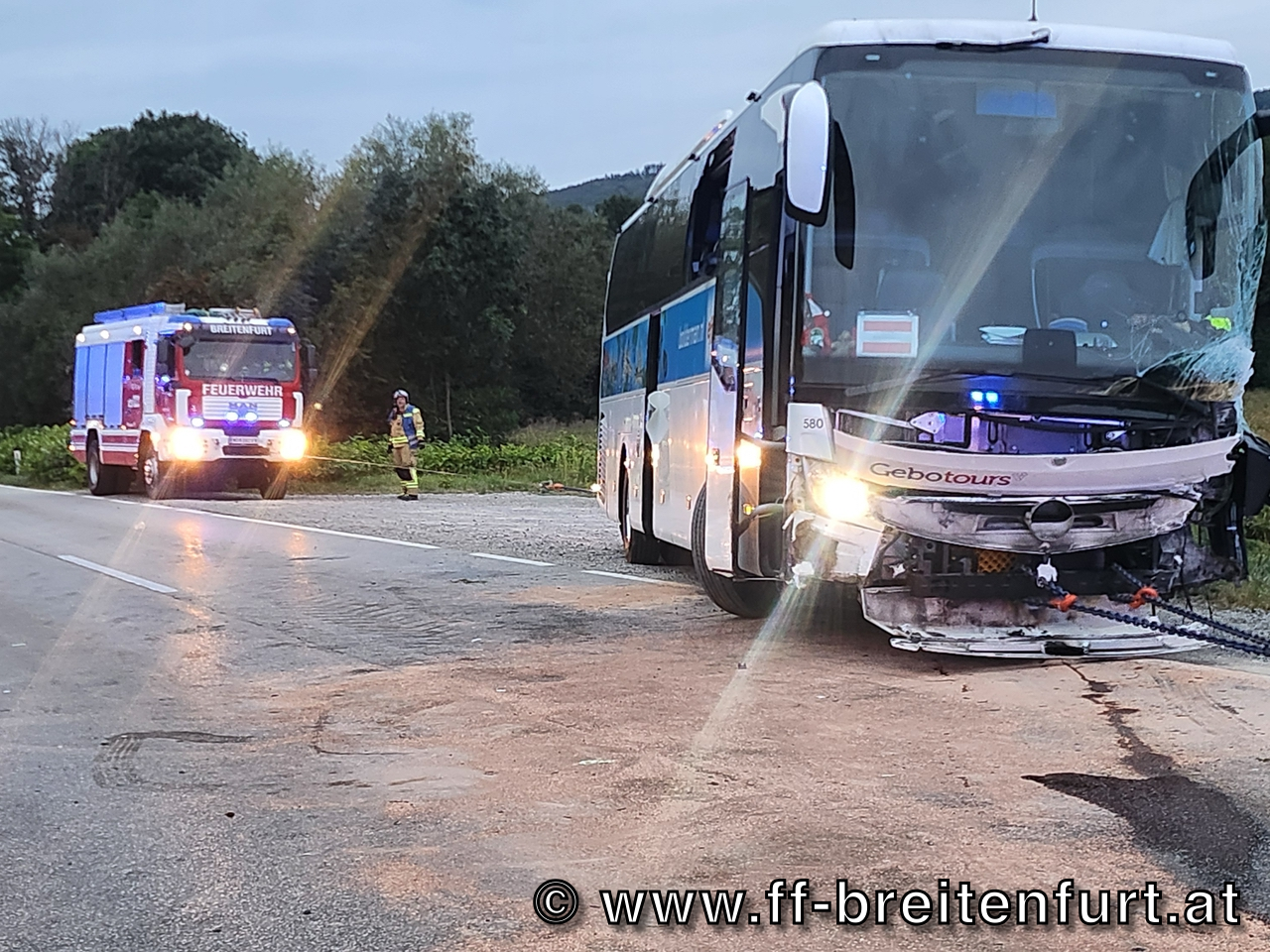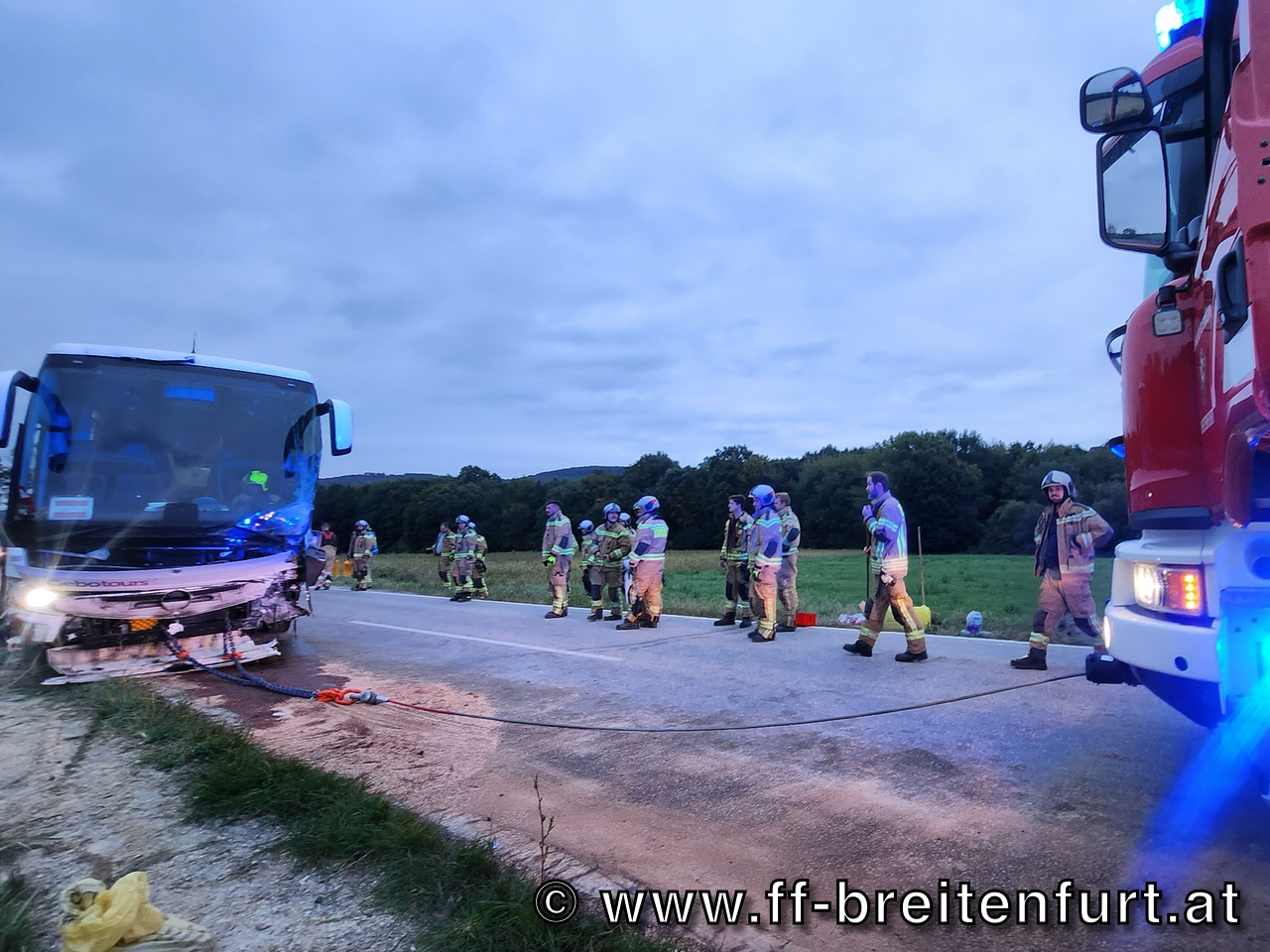 Der Lenker des PKW wurde in seinem Fahrzeug eingeklemmt und erlag noch an der Unfallstelle seinen schweren Verletzungen. Zahlreiche Insassen des Reisebusses wurden verletzt.