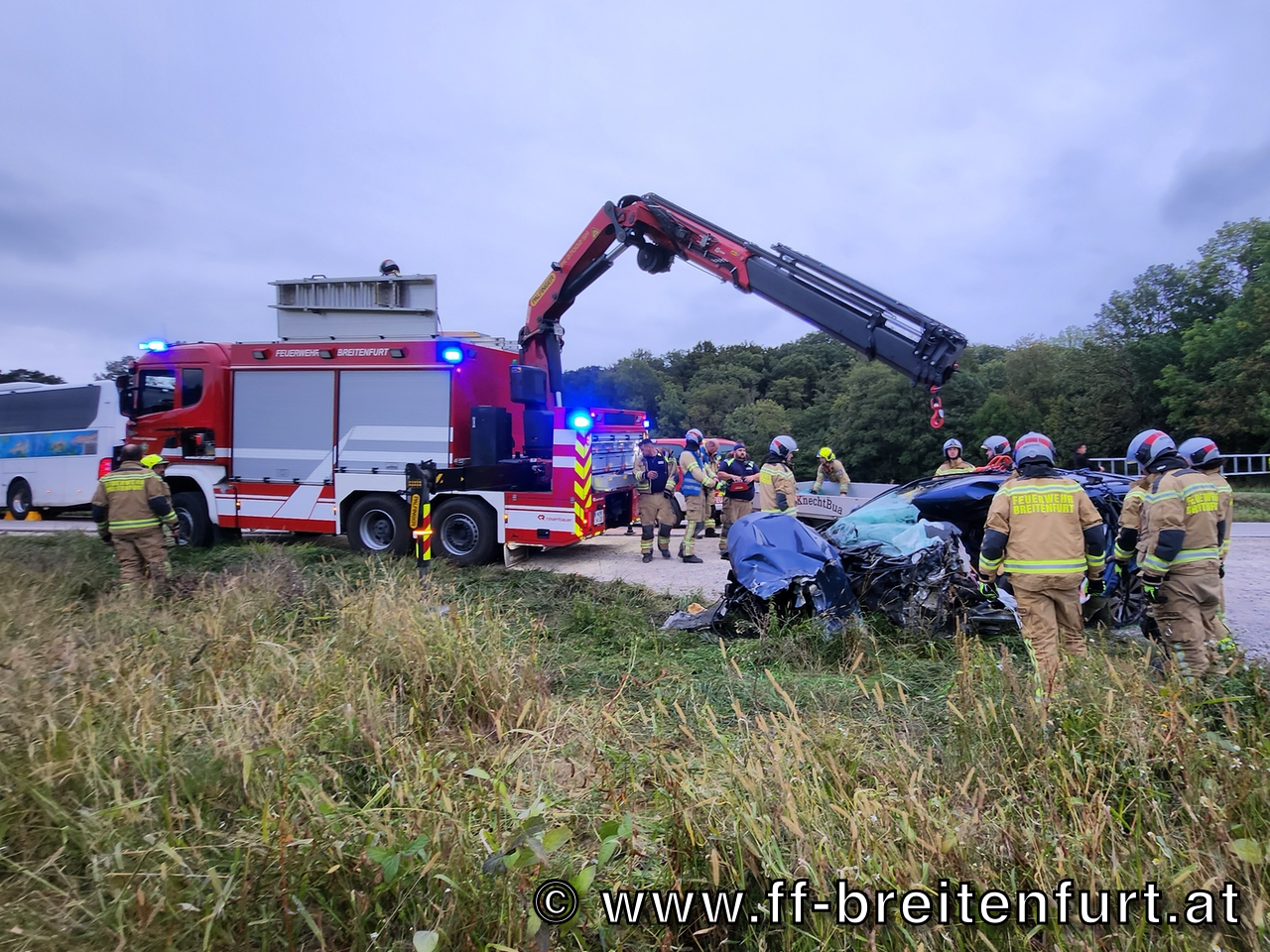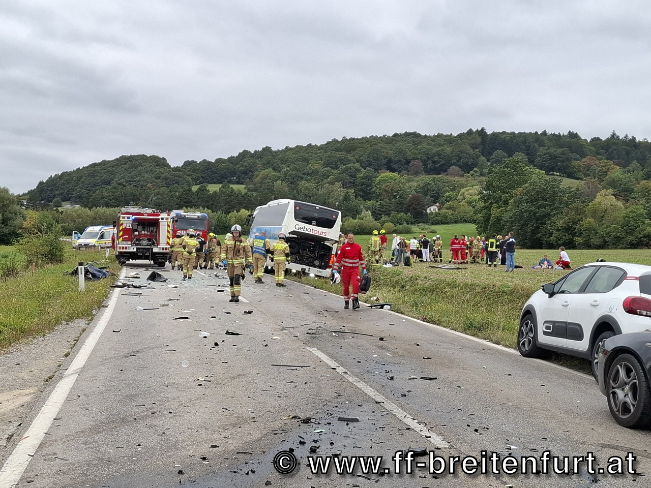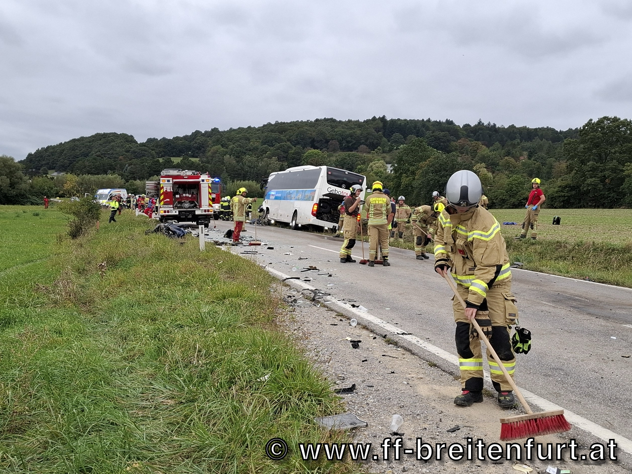 Der Lenker des PKW wurde in seinem Fahrzeug eingeklemmt und erlag noch an der Unfallstelle seinen schweren Verletzungen. Zahlreiche Insassen des Reisebusses wurden verletzt.
