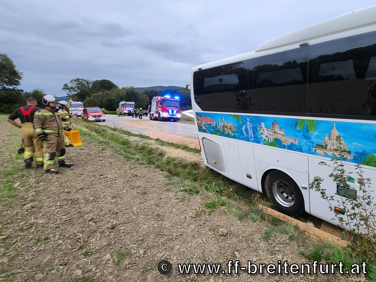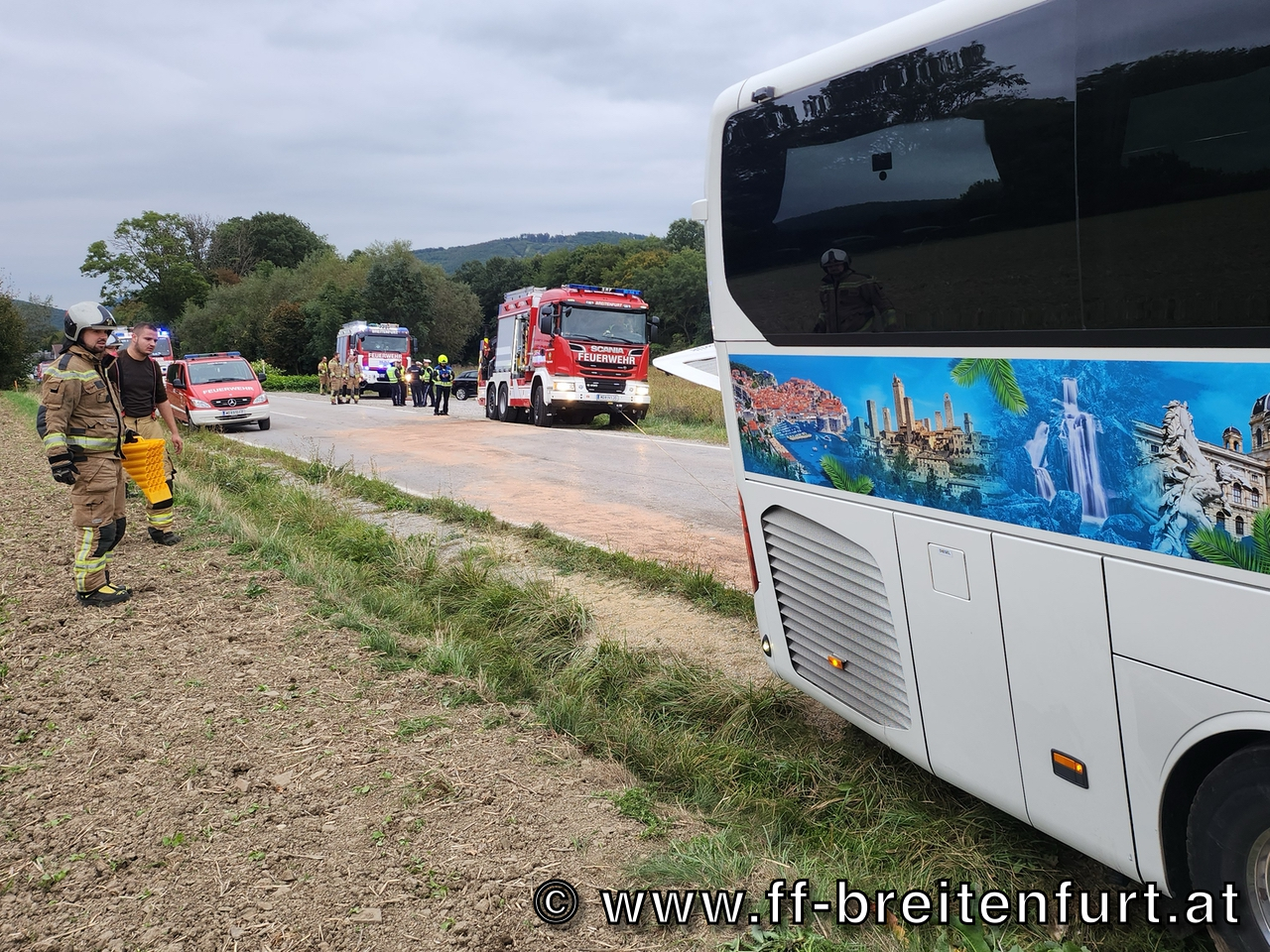 Ein PKW kollidierte aus bislang unbekannter Ursache mit einem Reisebus. In weiterer Folge kam der Bus seitlich im Straßengraben zum Stillstand, während der PKW von der Fahrbahn abkam und im angrenzenden Feld zum Stehen kam.