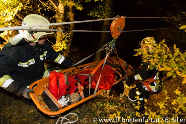 An der Einsatzstelle im Rechten Graben wurden die drei Verletzten mittels Rettungswanne und Greifzug gerettet, indem eine Schrägseilbergung aufgebaut wurde. Aufgrund einer notwendigen Reanimation eines Opfers musste zusätzlich eine Crashrettung eines Patienten aufgebaut werden. Diese wurde mittels einer schräg aufgestellten Steckleiter und einer gesicherten Rettungswanne, welche an der Steckleiter herabgelassen wurde erfolgreich erledigt.