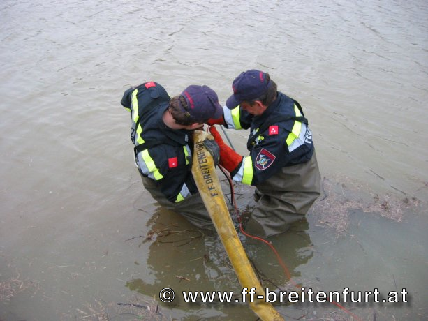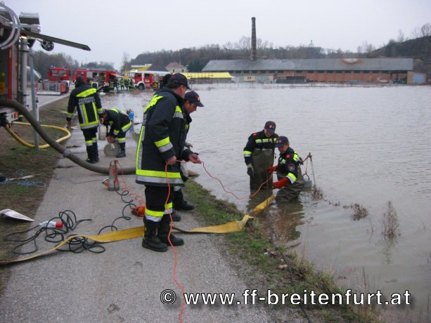 Um rund 18:30 Uhr konnte die Mannschaft aus Breitenfurt mit dem 2. KHD Bereitschaftszug ihre Arbeit aufnehmen. Aufgabe von ihnen war das Umpumpen eines See über einen Bahndamm in die March.