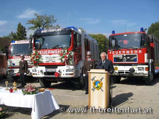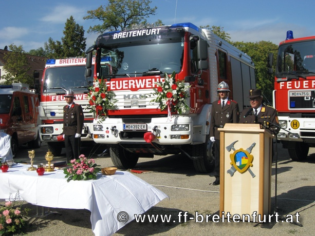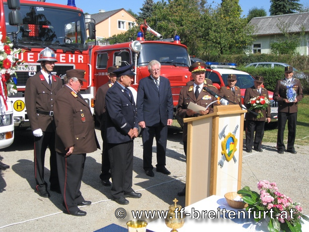 ABI Erwin Rautner mit einer Dankesrede für die Anschaffung des Fahrzeuges an die anwesende Bevölkerung. Auch Bürgermeister Ernst Herzig und Bezirkskommandant LFR Franz Koternetz fanden in ihren Worten viel Lob und Anerkennung für das Feuerwehrwesen in Breitenfurt.
