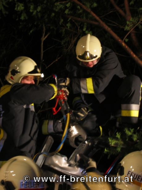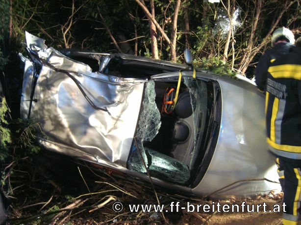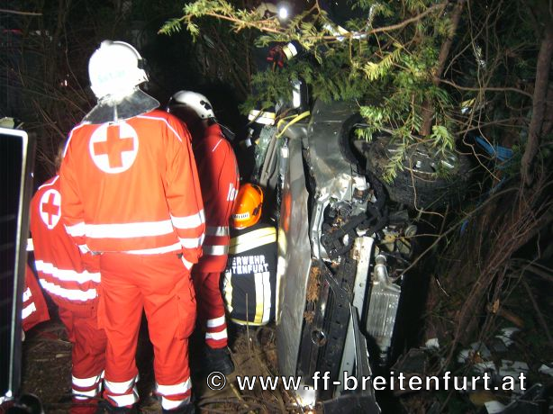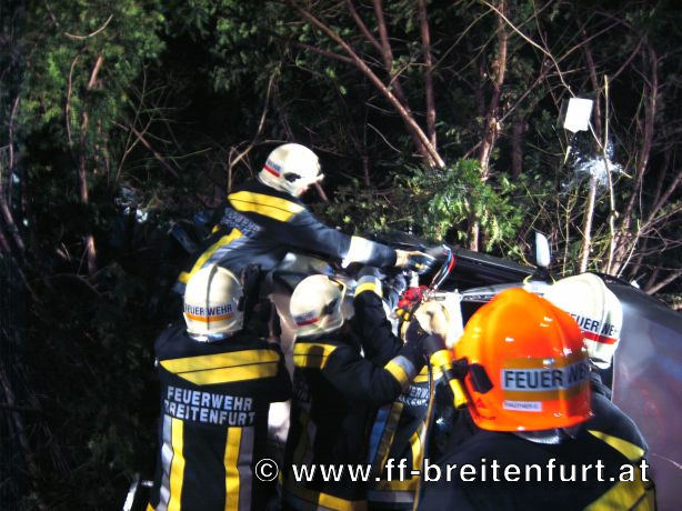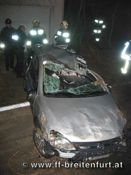Die Freiwillige Feuerwehr Breitenfurt wurde um 00:54 Uhr von der BezirksAlarmZentrale Mödling mittels Sirene und Funkmeldeempfänger zu einem Verkehrsunfall mit eingeklemmter Person alarmiert. Das SRF rückte bereits, besetzt mit drei Mann, beim abklingen des letzten Sirenensignals aus. An der Einsatzstelle angekommen bot sich den Einsatzkräften folgende Lage. Ein PKW lag etwa sechs Meter von der Fahrbahn entfernt auf der Beifahrerseite im Wald. Durch die leichte Hangneigung drohte der PKW auf das Dach zu rollen, da das Fahrzeug nur Heckseitig von einigen kleinwüchsigen Bäumen in seiner Position gehalten wurde. Der Rettungsdienst war bereits anwesend und versuchte einen Zugang zur verletzten Person zu schaffen. Da die Unfallstelle von der Gendarmerie bereits abgesichert war konnte sich die Feuerwehr rein auf die Menschenrettung konzentrieren.