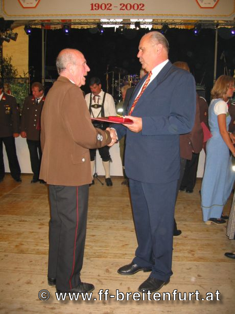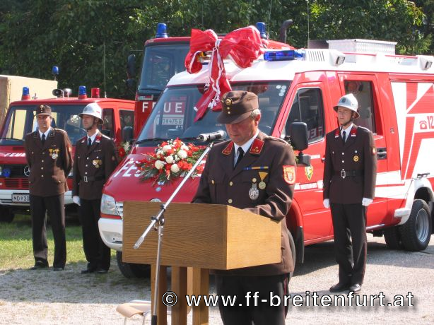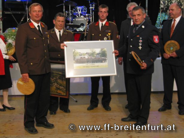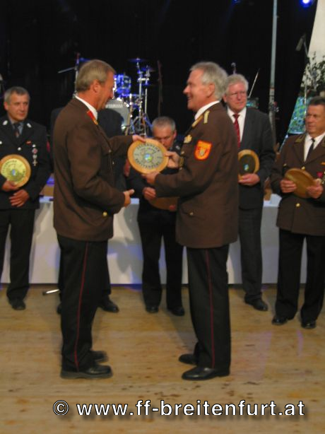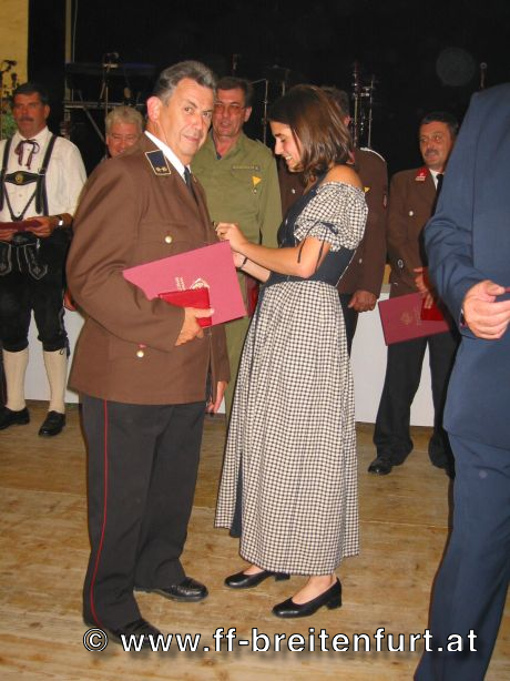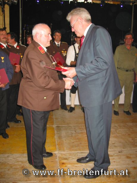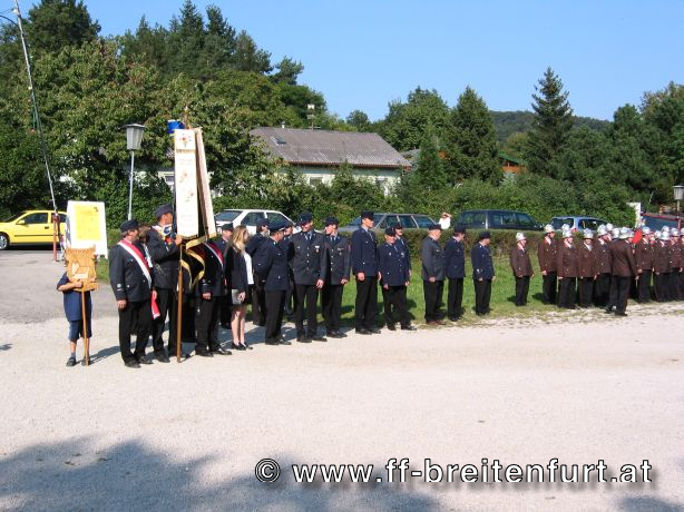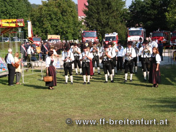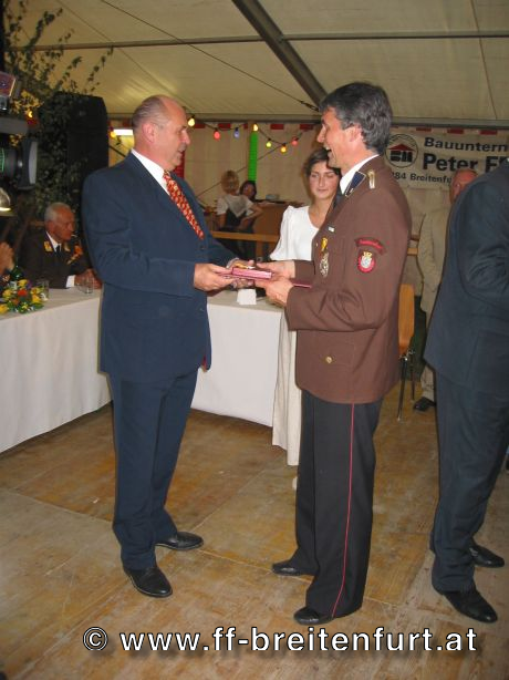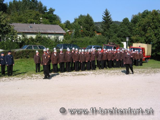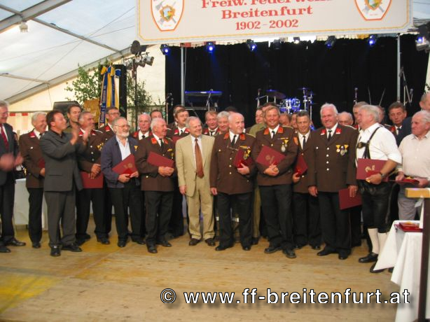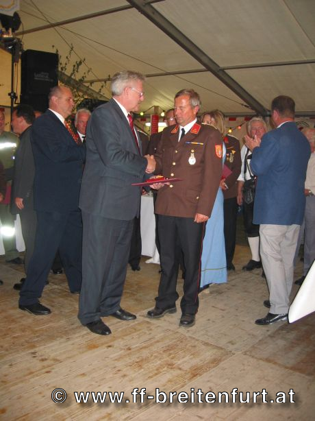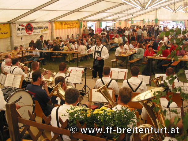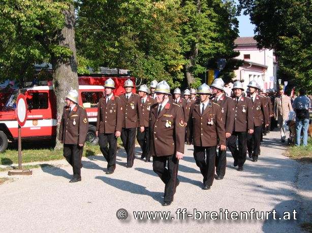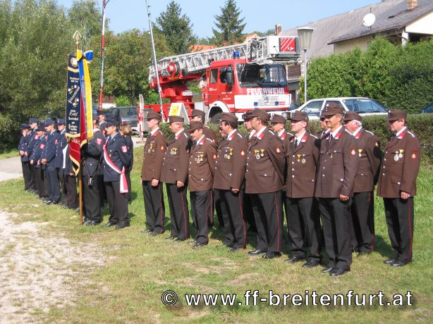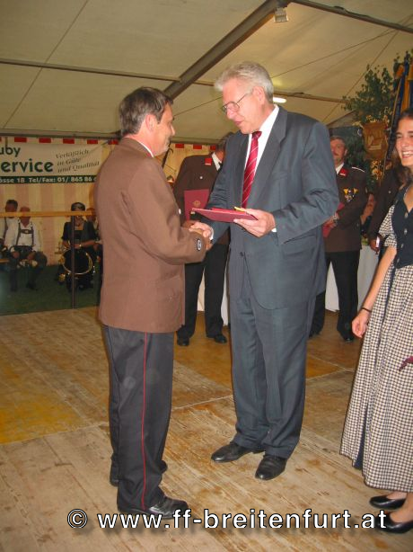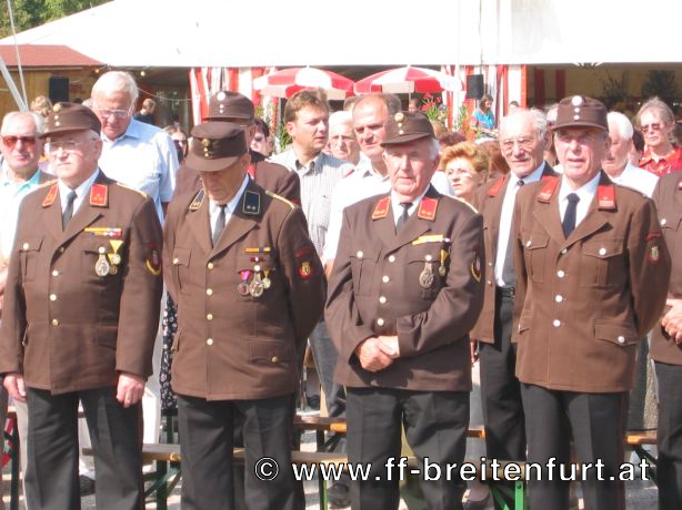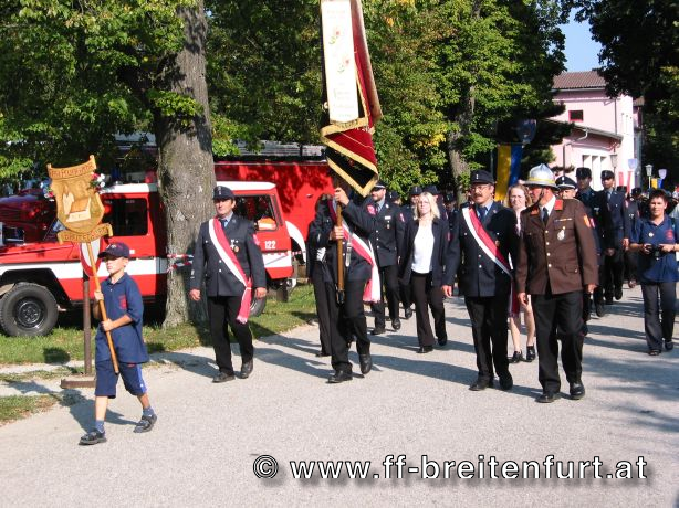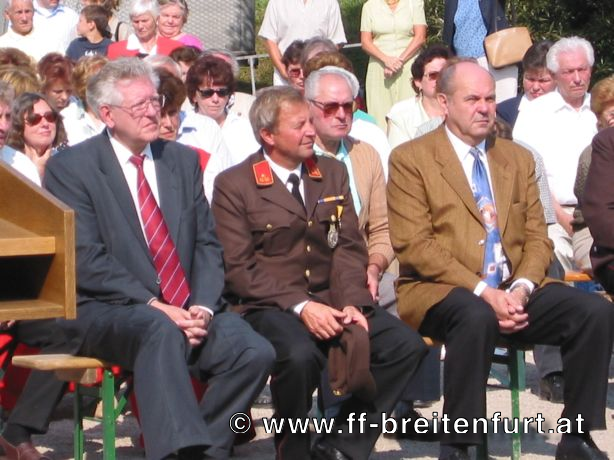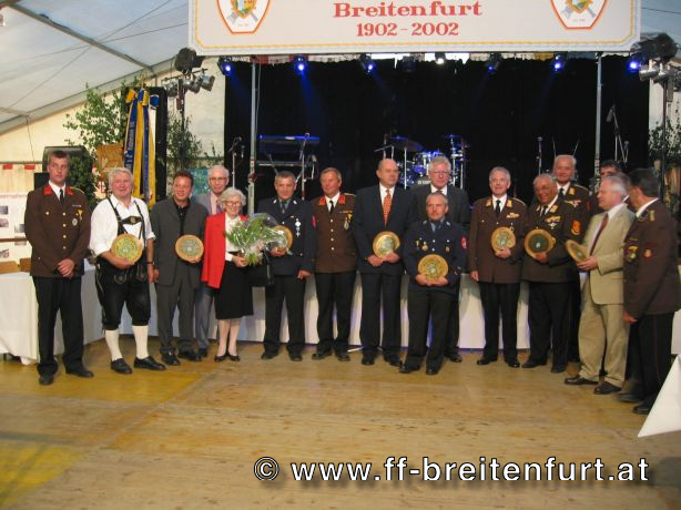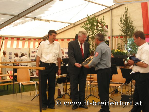 Anschließend fand der offizielle Höhepunkt der Veranstaltung, die Festsitzung anlässlich des 100jährigen Gründungsjubiläums, moderiert vom Feuerwehrkameraden LM Arnold Link, statt. In einem vollen Festzelt konnte Kommandant HBI Erwin Rautner neben dem Bezirksfeuerwehrkommandanten OBR Franz Koternetz und seinem Stellvertreter BR Karl Blieberger sowie den Abschnittsfeuerwehrkommandanten ABI Franz Sittner und Ehrenoberbrandrat Florian Breis auch den Abgeordneten zum Landtag Hannes Weninger und Bezirkshauptmann Dr. Hannes Nistl sowie eine große Zahl der Gemeinderäte begrüßen. In seiner Festansprache dankte Bürgermeister Ernst Herzig, der seine Rede mit den Worten „aus der Geschichte gewachsen, in der Gegenwart bewährt und in der Zukunft unverzichtbar“ begann, der Breitenfurter Feuerwehr für die hervorragende Einsatzbereitschaft und den Kameradschaftsgeist. Im Anschluss an die Festansprache erfolgte die Ehrung der Feuerwehrmänner durch die Gemeinde. Es wurden Ehrenurkunden sowie Ehrenplaketten an die Feuerwehrkameraden durch Bürgermeister Herzig und Vizebürgermeister Peter Klimek übergeben. Bezirkshauptmann Dr. Nistl ließ es sich nicht nehmen ebenfalls allen Feuerwehrmännern für ihren Einsatz persönlich zu danken. Nach den Ansprachen von OBR Koternetz, Landtagsabgeordneten Weninger und Bezirkshauptmann Dr. Nistl dankte die Freiwillige Feuerwehr Breitenfurt allen ihr verbundenen Organisationen und Vereinen, sowie der Gemeindevertretung und den Ehrenmitgliedern der Freiwilligen Feuerwehr durch die Überreichung eines Wappentellers. Zum Abschluss gratulierte eine Vielzahl von örtlichen Vereinen der Feuerwehr Breitenfurt zum Gründungsjubiläum. Die Umrahmung dieser Festsitzung gestalteten in festlicher Manier die Breitenfurter Jagdhornbläser. Den Abschluss des Festaktes bildeten Tänze der Volkstanzgruppe Breitenfurt.