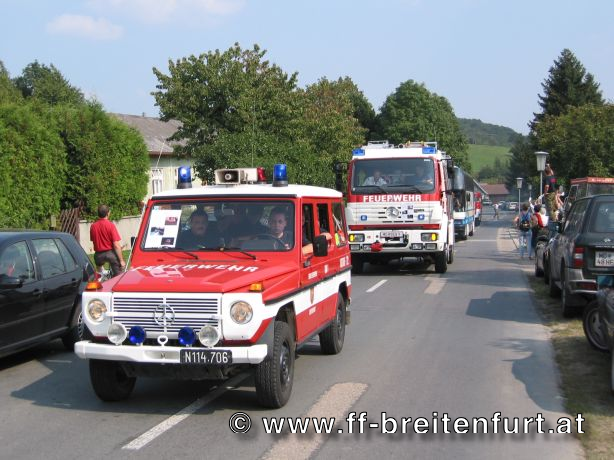Am Samstag traf man sich am Parkplatz des für die Feuerwehr geschichtsträchtigen Gasthofes Ulm. Hier erfolgte vor 100 Jahren die Gründung der Feuerwehr Breitenfurt. Nach einem Platzkonzert des Musikvereines Breitenfurt formierte sich der Festzug und die Kameraden unser Partnerfeuerwehr und die Breitenfurter Wehr marschierten gemeinsam, musikalisch begleitet vom Musikverein Breitenfurt, vom Gasthaus Ulm zum Festzelt. Mit einer Fahrzeugpräsentation wurden die Einsatzfahrzeuge der Freiwilligen Feuerwehr den anwesenden Besuchern vorgestellt.