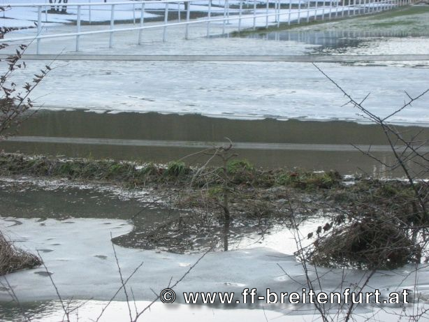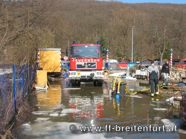 Da der Wasserspiegel bereits kurz vor der Eingangstüre in die Wohnung stand und weiter anzusteigen drohte, wurde der Eigentümer bei den bereits eigenständigen Pumpmaßnahmen unterstützt. Mittels drei Unterwasserpumpen wurde das Oberflächenwasser in den vor dem Objekt befindlichen Kanal gepumpt. Mittels der TS wurde der am Nachbargrund entstandene Schmelzwassersee ebenfalls in den Kanal gepumpt.
