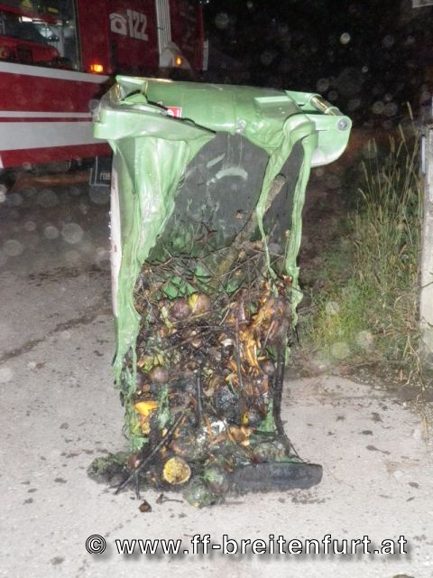 Aus unbekannter Ursache war es zum Brand einer Restmülltonne gekommen, welcher vollständig ausbrannte und die daneben stehende Biomülltonne, einen Holzstoß sowie die Fassade in Mitleidenschaft zog. Der Hausbesitzer konnte den Brand mit eigenen Mitteln selbständig löschen.