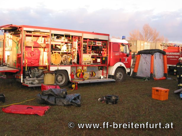 Nach auswerten der Messergebnisse und den Information des Angriffstrupps konnte mit den ersten Umpumpmaßnahmen begonnen werden. Diese wurden von der FF Wr. Neudorf mit Unterstützung der FF Perchtoldsdorf durchgeführt. Die Dekoeinheit wurde ebenfalls von der FF Perchtoldsdorf bereitgestellt.