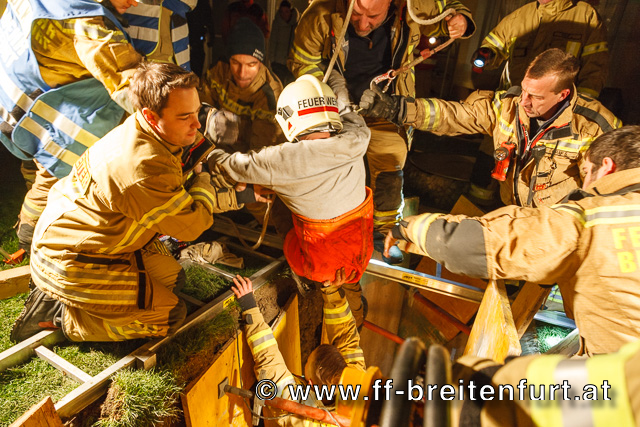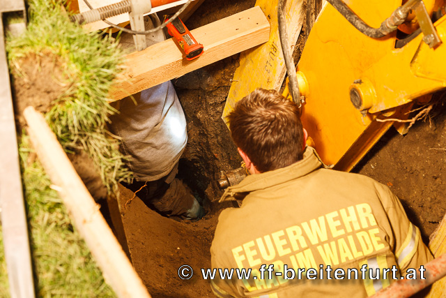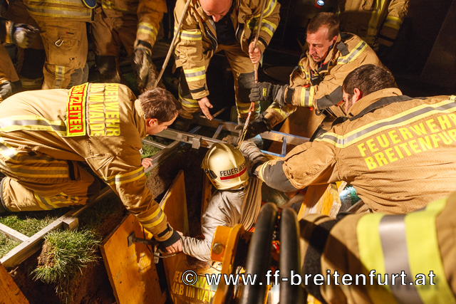 Nach 2-stündigen mühsamen Grabungsarbeiten, durch laufendes Wechseln der in der Tiefe arbeitenden Mannschaften konnte schlussendlich der Arbeiter mittels Bergetuch händisch aus der Grube gehoben und an den Rettungsdienst übergeben werden.