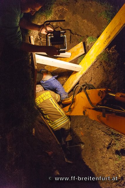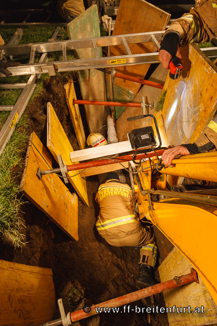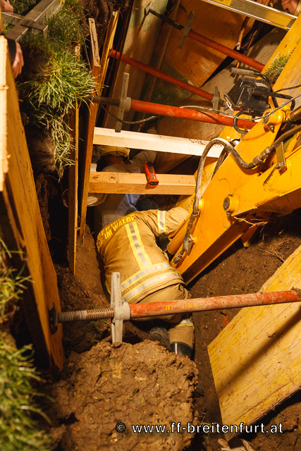 Als Erstmaßnahme wurde von der FF Laab im Walde die Baugrube mittels Schaltafeln und Pölzholz abgesichert um ein weiteres Nachrutschen von Erdreich zu verhindern. Parallel dazu wurden Steckleiternteile um die Baugrube herum aufgelegt um die Last der Einsatzkräfte besser auf den Untergrund zu verteilen. Danach wurde begonnen mittels Pionierspaten und kleinen Schaufeln die verschütteten Beine freizulegen.