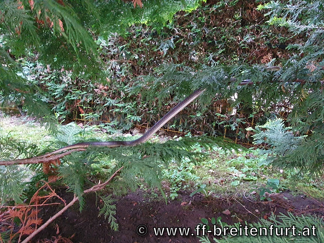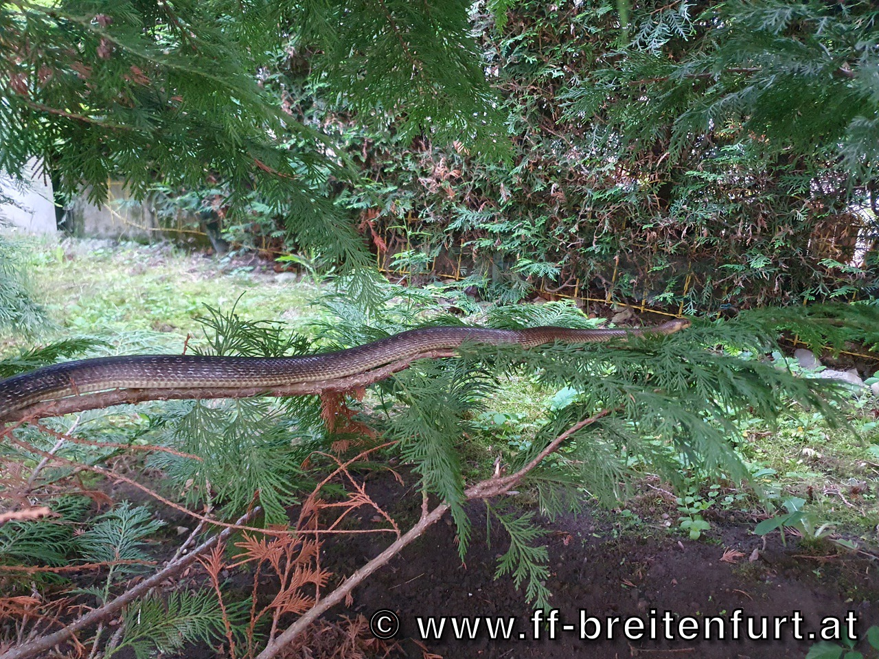 Beim unserem Eintreffen konnte das Tier – eine Äskulapnatter – nicht mehr im Schacht vorgefunden werden. Die Schlange hatte sich bereits selbstständig befreit und befand sich in einem nahegelegenen Baum. Kurz darauf flüchtete sie in Richtung eines angrenzenden Nachbargrundstücks.