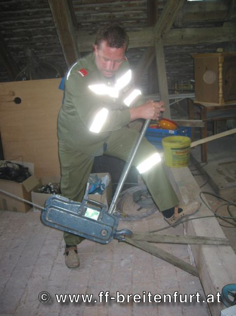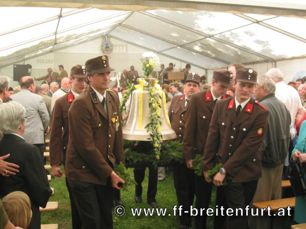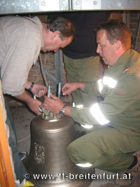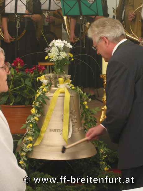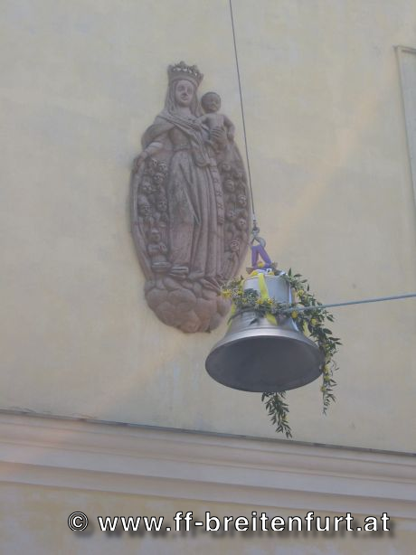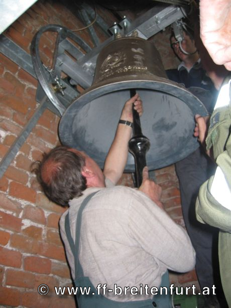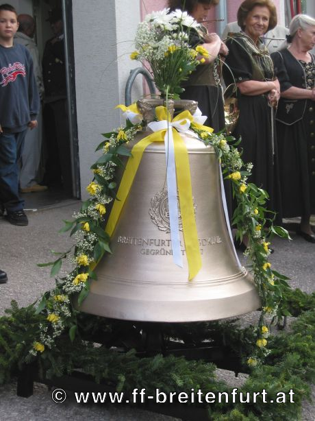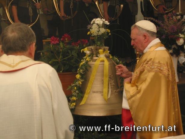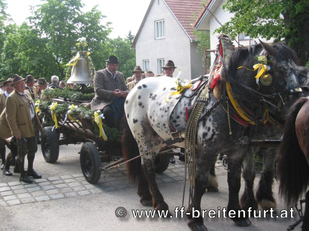 Die Glocke, die eine Spende des Breitenfurter Jagdklubs ist, wurde mit einem Vierergespann mit Norikerpferden vom Feuerwehrhaus im festlichen Zug mit Feuerwehr, Musikverein, Volkstanzgruppe, Männergesangverein sowie der örtlichen Politprominenz und einer Vielzahl von Besuchern zur Pfarrkirche gebracht. Die Freiwillige Feuerwehr hatte die Ehre die Glocke ins Festzelt, in dem die Weihemesse - bei der die Breitenfurter Jagdhornbläser eine Hornbläsermesse uraufführten - zelebriert wurde, zu tragen und danach vor die Kirche. Von dort wurde die 185 kg schwere Glocke (für musikalisch Interessierte: Stimmung der Glocke d2) mittels Greifzügen in den Glockenturm gehievt. Ca. 500 Personen wohnten diesem wohl einmaligen Erlebnis bei und konnten um 12.00 Uhr beim Mittagsgeläute die neue „Hubertusglocke“ zum ersten Mal hören.