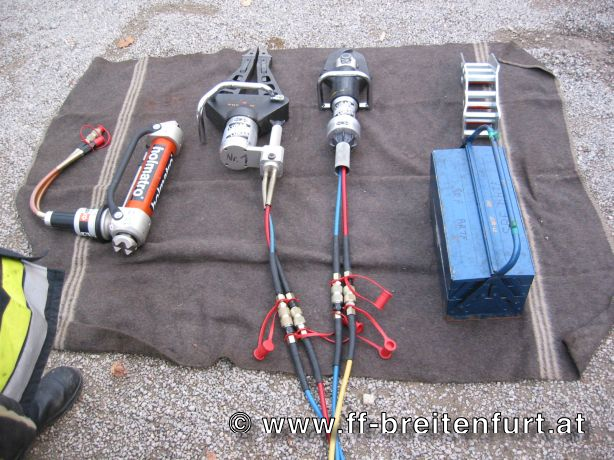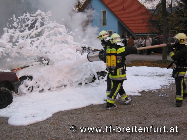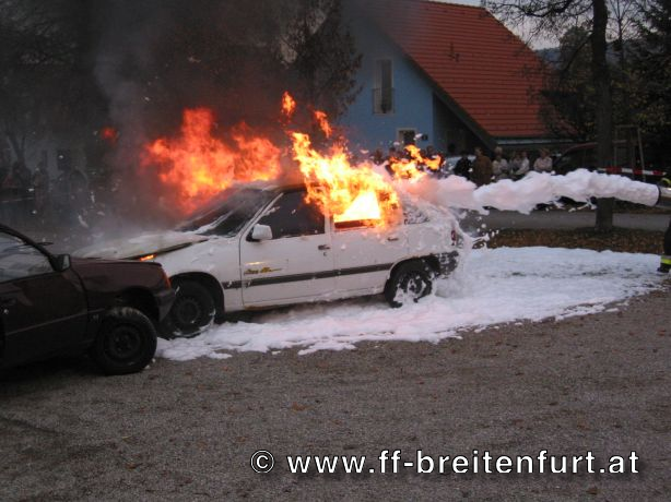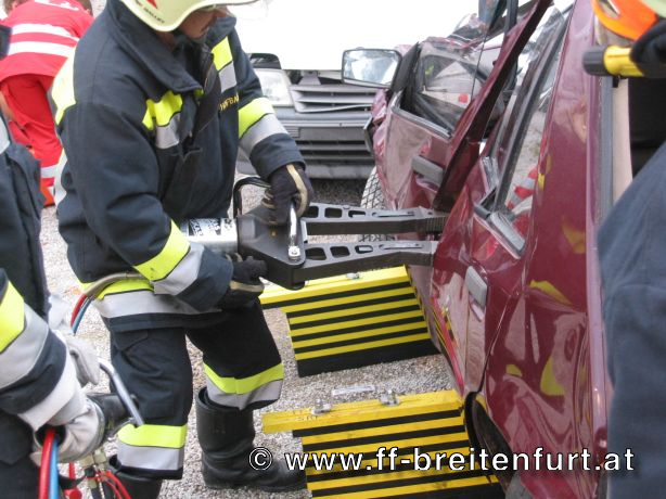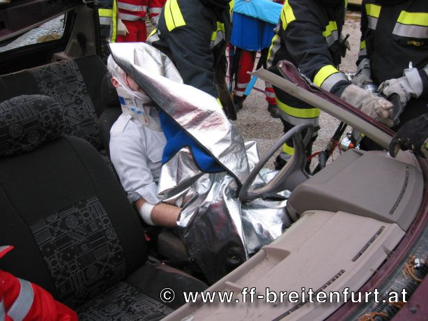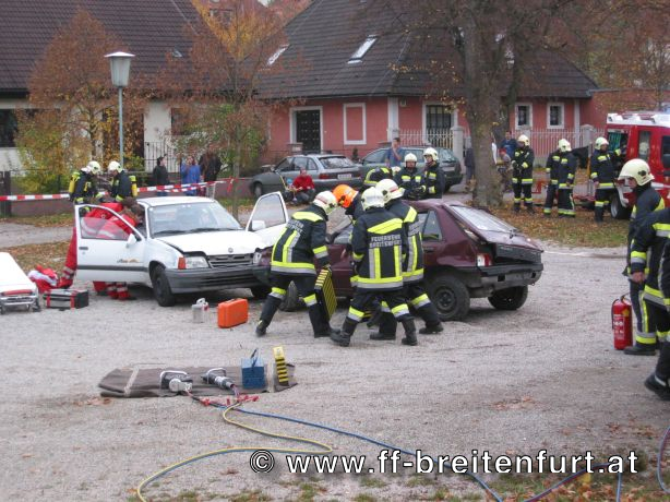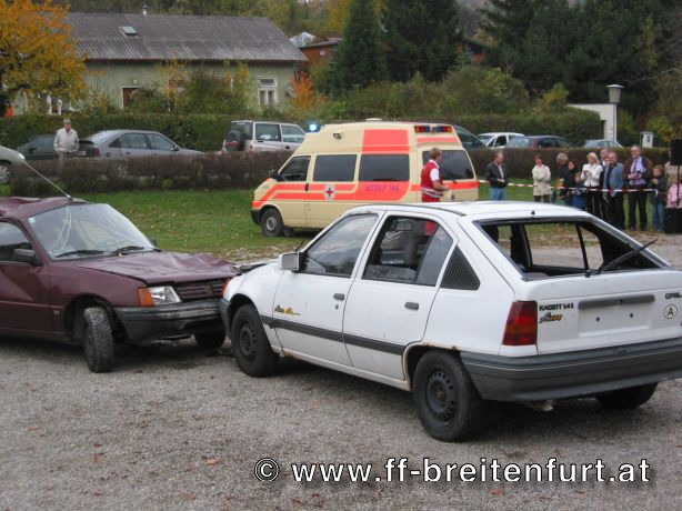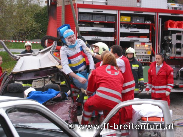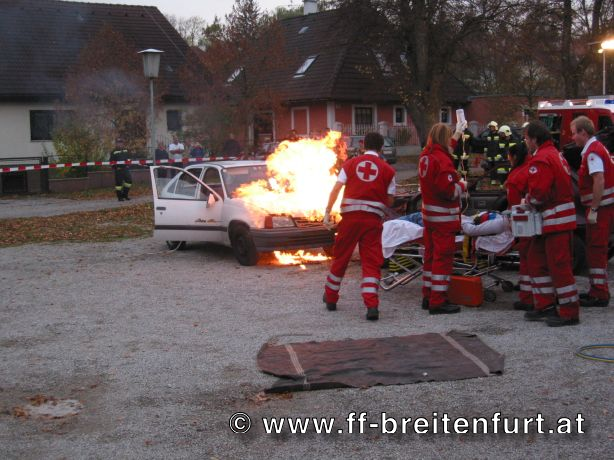 Nachdem die Präsentation beendet war, startete die gemeinsame Einsatzvorführung der Feuerwehr und des Roten Kreuz Breitenfurt. Für die Einsatzkräfte galt es, einen Verkehrsunfall mit zwei PKWs und zwei verletzten Personen, wobei eine in ihrem Unfallfahrzeug eingeklemmt war, zu bewältigen. Die Rettungsaktion wurde von den beiden Kommentatoren dem Publikum näher gebracht, und die Vorgangsweisen bei den einzelnen Rettungsschritten erklärt. Kurz vor Ende des Einsatzes, und nach der vollzogen Menschenrettung begann dann plötzlich ein Fahrzeug zu brennen. Der Brand konnte jedoch dank zuvor bereitgestelltem Brandschutz, unter Vornahme eines Mittelschaumrohres, gelöscht werden.
