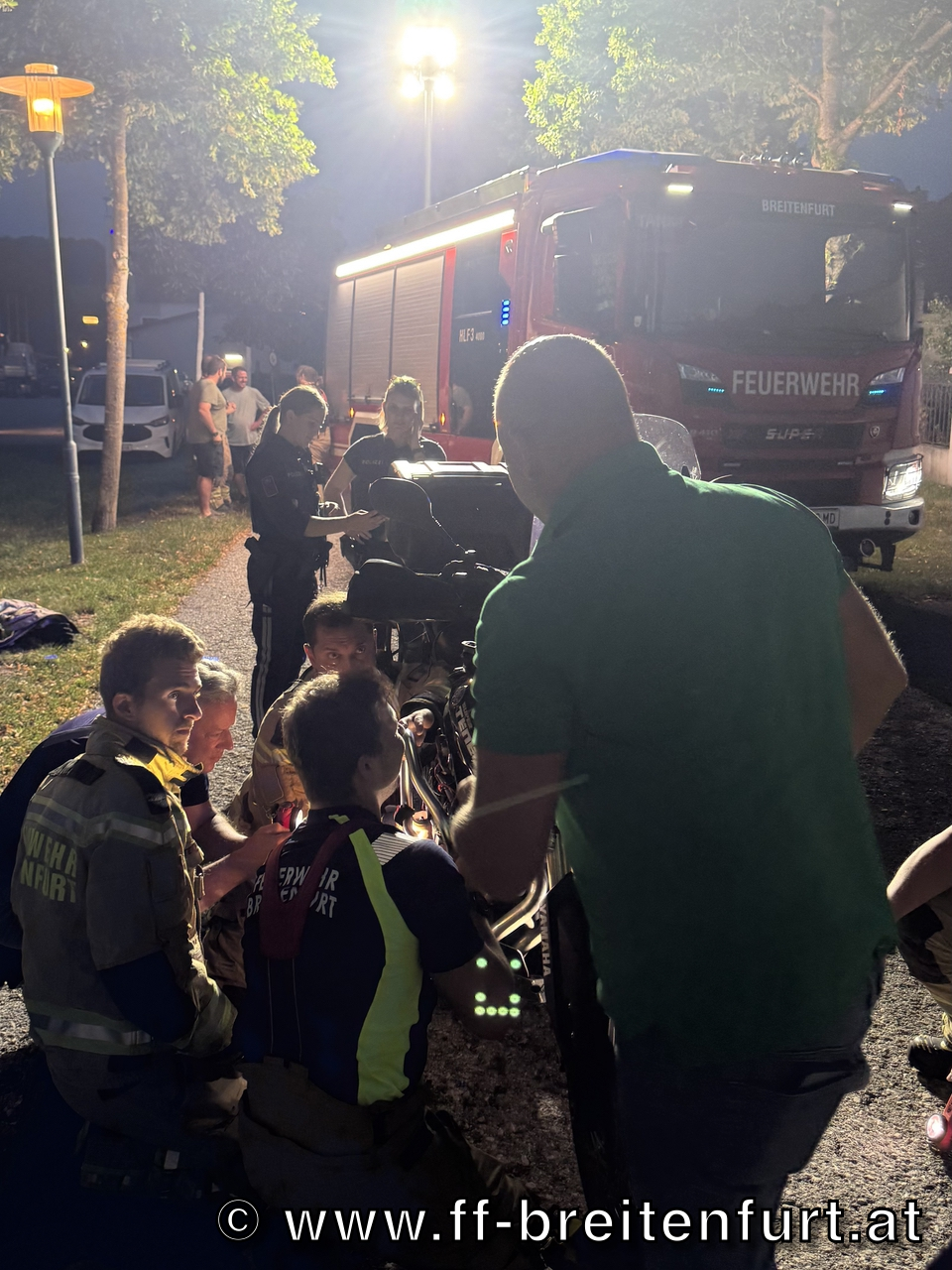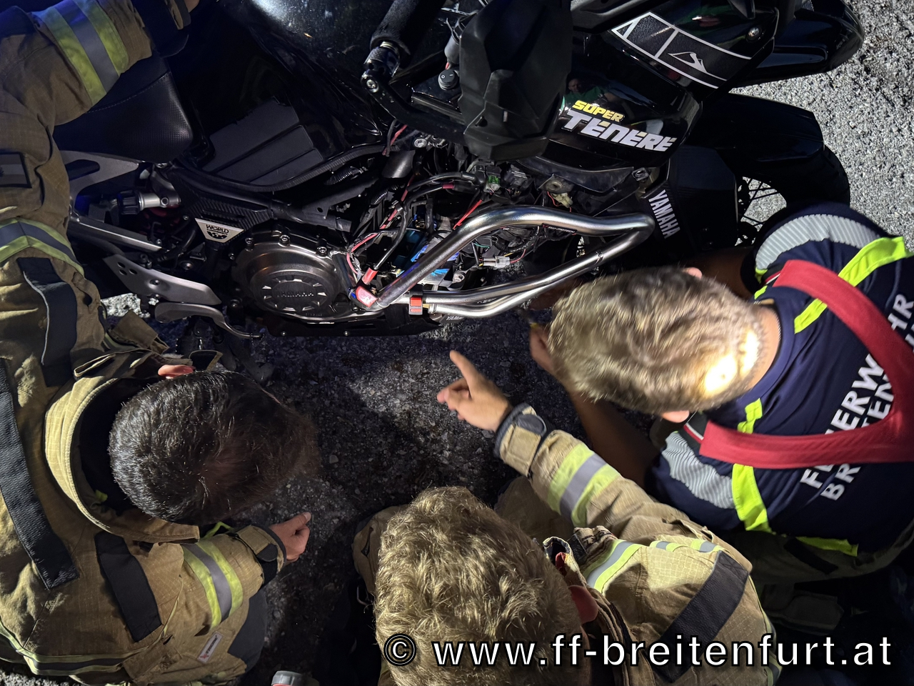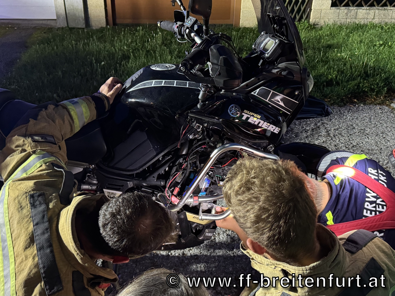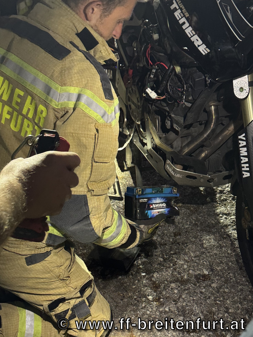Bei unserem Eintreffen stand der Motorradlenker bereits am Fahrbahnrand und meldete ein Problem mit seiner Maschine: Die Batterie fühlte sich sehr warm an und blähte sich bereits auf.