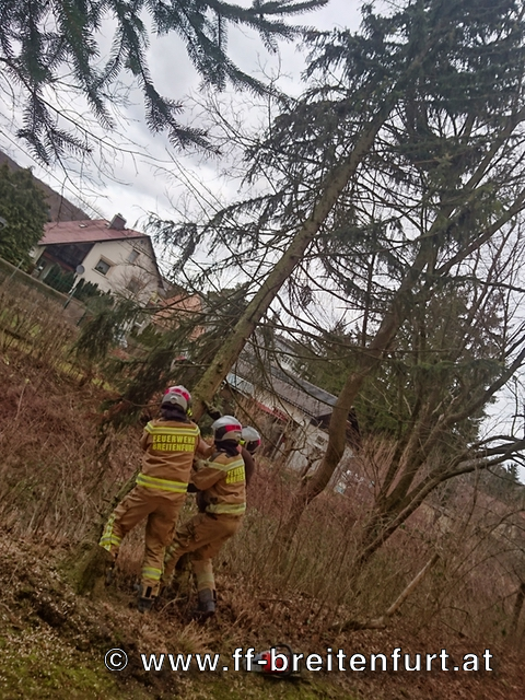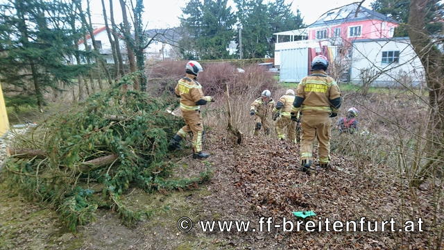 Die entwurzelte Fichte wurde mittels Motorkettensäge umgeschnitten, zerkleinert und am Grundstück gesichert abgelegt.