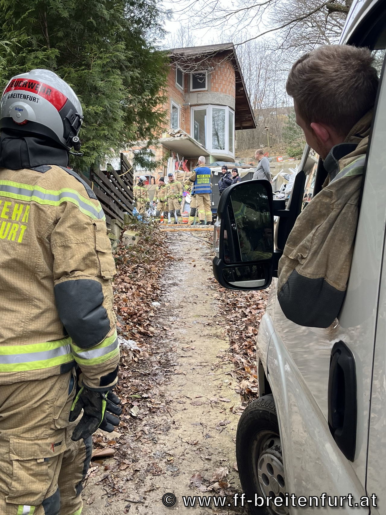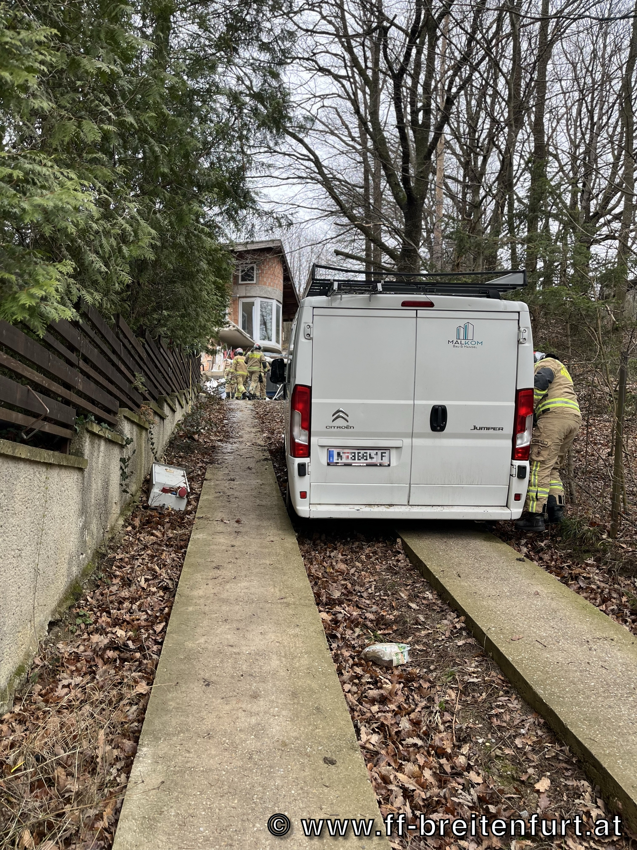 Ein PKW war bei der bergauf verlaufenden Zufahrt auf sein Grundstück von den Fahrbahnstreifen abgerutscht und kam zwischen den Betonstreifen zum Stillstand. Aufgrund der steilen und rutschigen Gegebenheiten war ein selbstständiges Weiterkommen für den Fahrzeuglenker nicht mehr möglich.