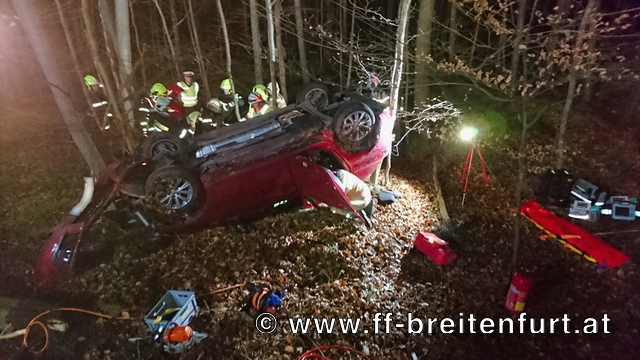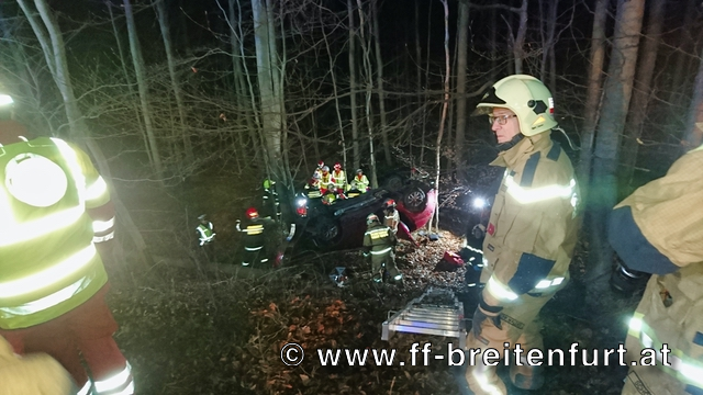 Im Bereich einer Doppelkurve konnte das Fahrzeug schließlich im Graben, am Dach liegend, aufgefunden werden. Sofort wurde ein Zugang, über mehrere Steckleitern, zu dem abgestürzten Fahrzeug geschaffen und danach gleich mit der Menschenrettung begonnen.