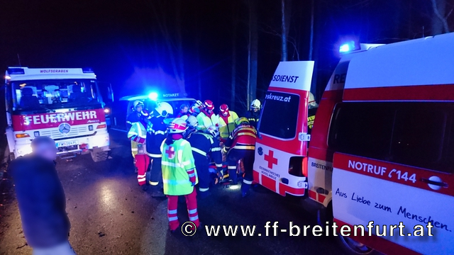 FF Tullnerbach zu einem Verkehrsunfall mit Menschenrettung am Kleinen Semmering in Wolfsgraben alarmiert. Da die Unfallsanzeige über das fahrzeugeigene Warnsystem kam musste das verunfallte Fahrzeug erst gesucht werden.