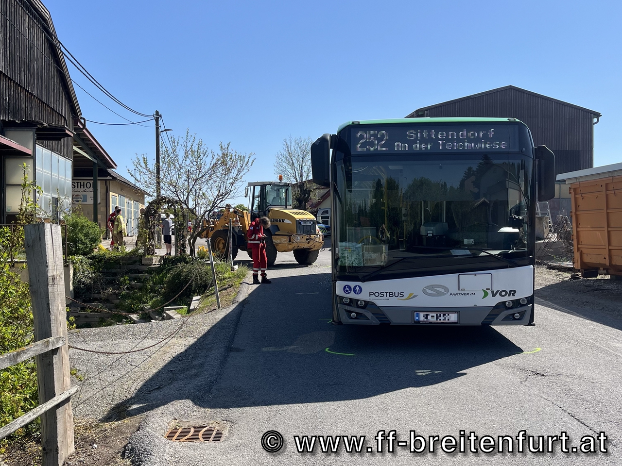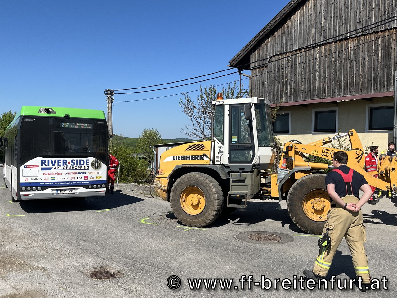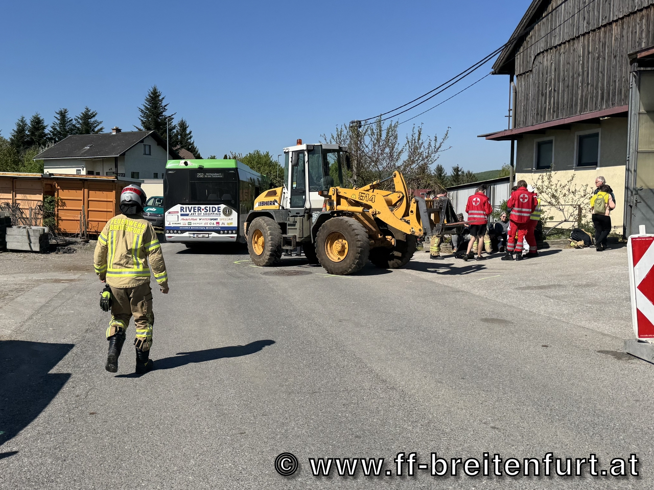 Am 28. April 2025 wurde die Freiwillige Feuerwehr Breitenfurt zu einem technischen Einsatz auf die Hochrotherdstraße alarmiert. Ein Radlader war aus bislang unbekannter Ursache beim Rückwärtsausparken gegen einen Autobus gestoßen. Dabei wurde der Autobus seitlich beschädigt.
