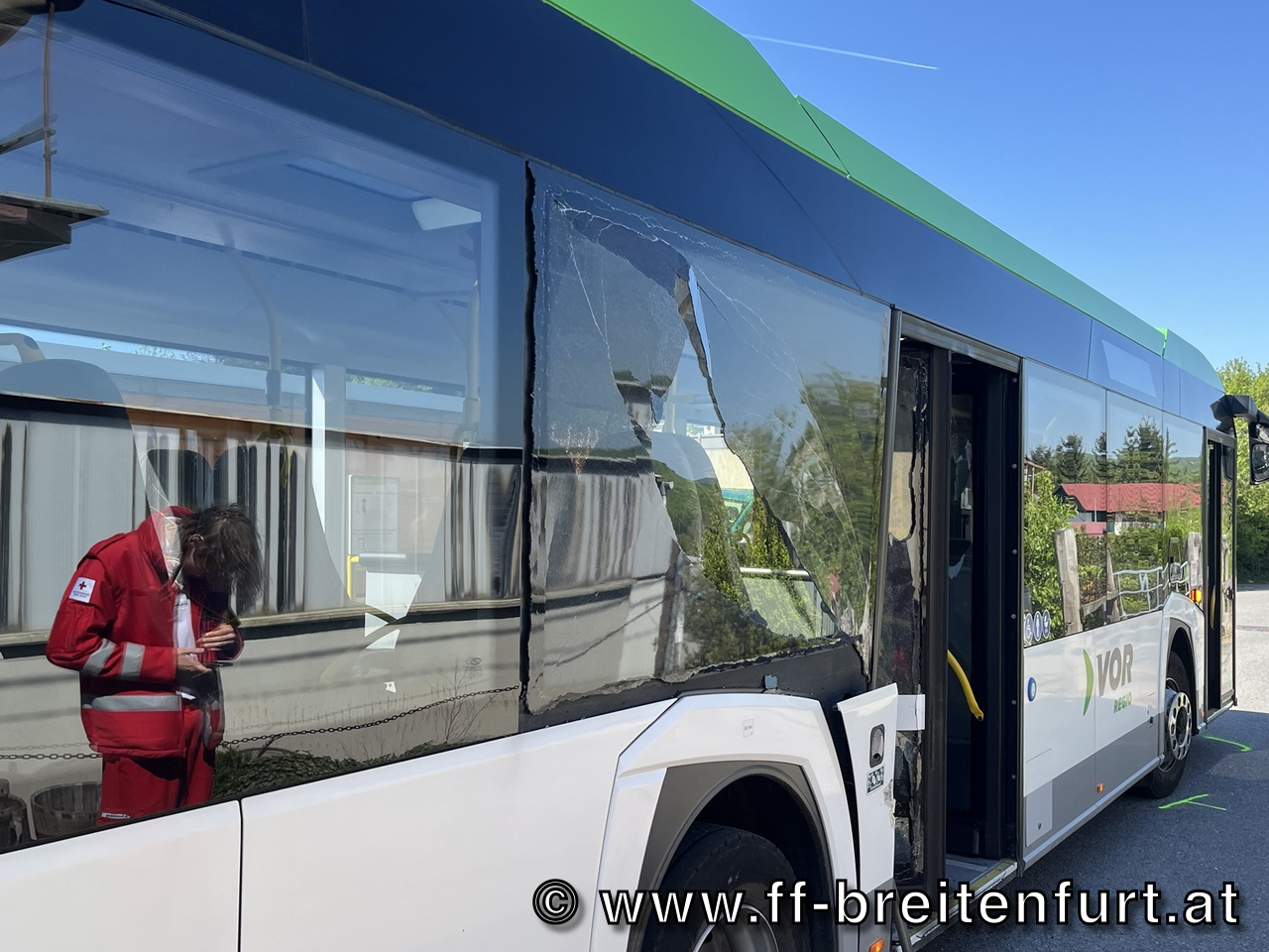 Beim Eintreffen der Einsatzkräfte waren keine Fahrgäste mehr im Autobus. Polizei, First Responder aus Breitenfurt sowie mehrere Fahrzeuge des Rettungsdienstes waren bereits vor Ort.