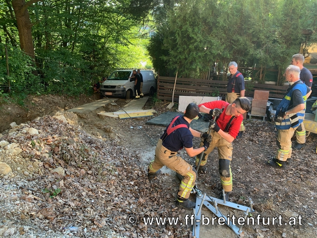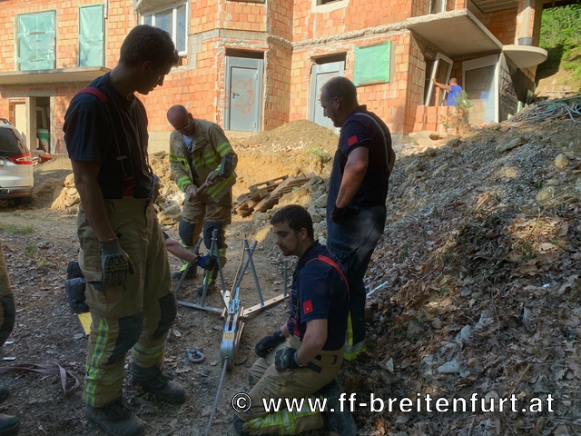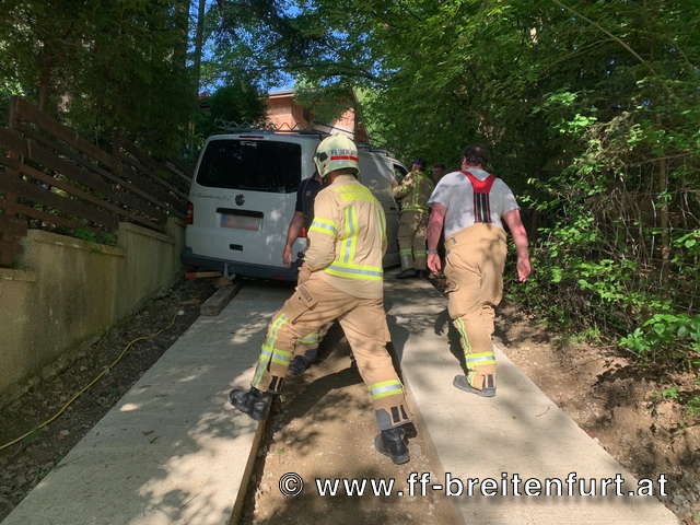 Da eine Bergung mittels Feuerwehrauto und Seilwinde nicht möglich war, musste eine Freilandverankerung geschlagen werden. Mit dem an der Freilandverankerung befestigten Greifzug wurde das Fahrzeug angeschlagen und im direkten Zug zurück auf die betonierte Zufahrtsrampe gezogen. Danach wurde der VW Bus gesichert auf die Straße abgelassen und dem Besitzer unbeschädigt übergeben.