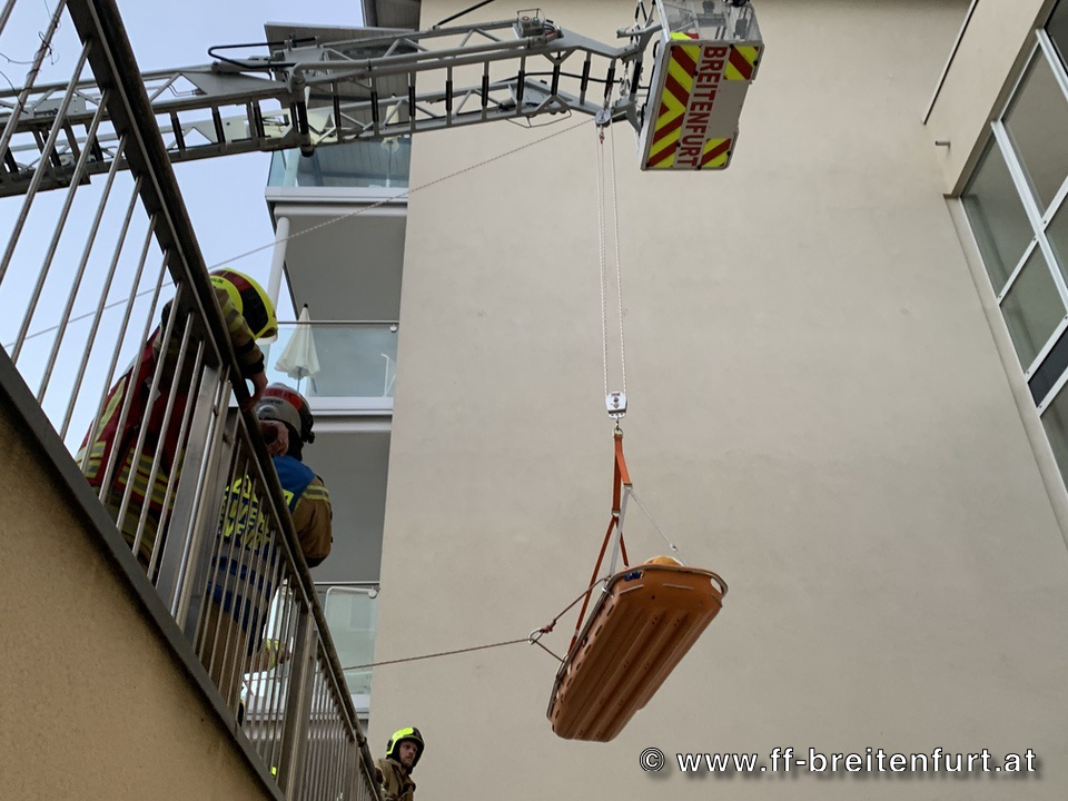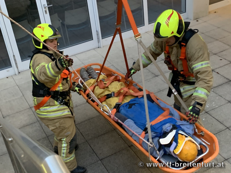 Gemeinsam mit der FF Laab im Walde führte die Mannschaft der DREHLEITER und des TANK 1 eine Personenrettung aus einem tiefergelegenen Vorplatz durch. Dabei kam eine Korbschleiftrage in Verbindung mit dem Kendler-Flaschenzug über die DREHLEITER zum Einsatz.