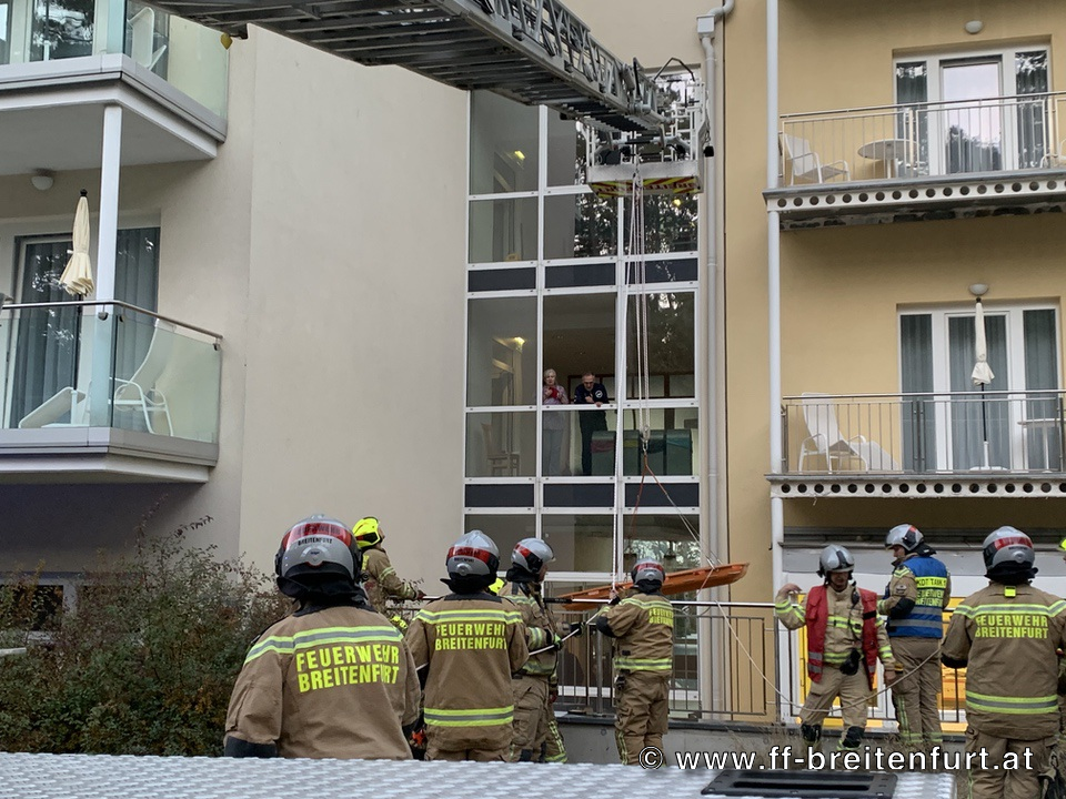An der Rückseite des Gebäudes mussten mehrere Personen über Fenster aus ihren Zimmern befreit werden. Diese Rettungen erfolgten mit Unterstützung der DREHLEITER.