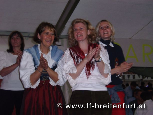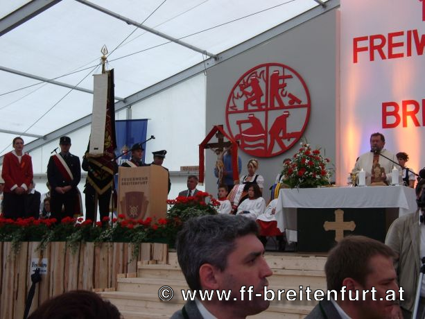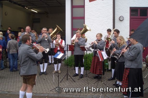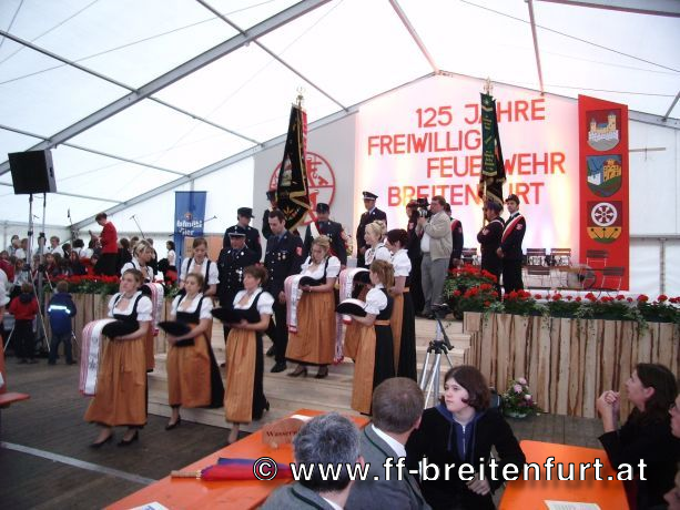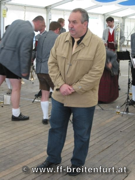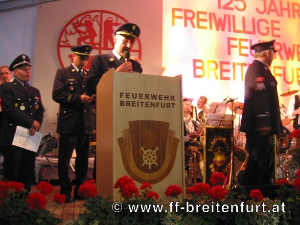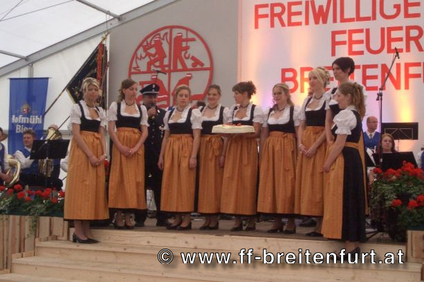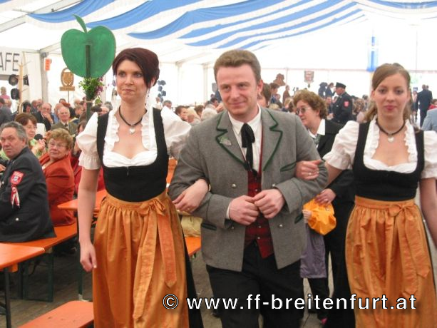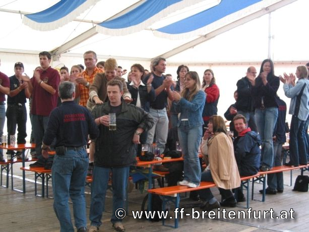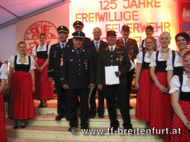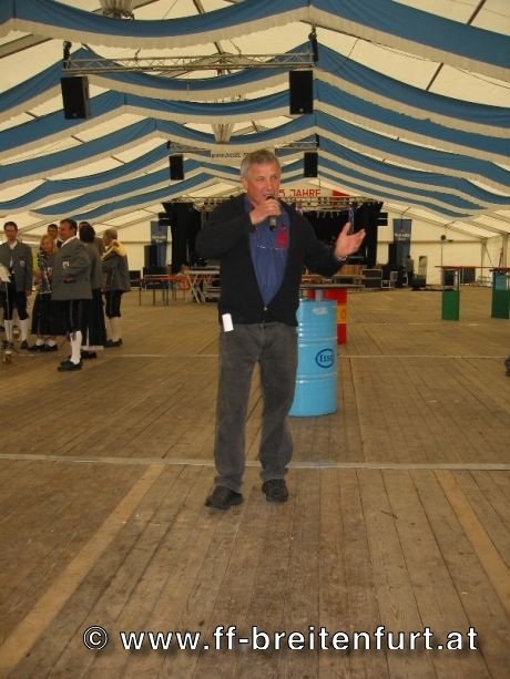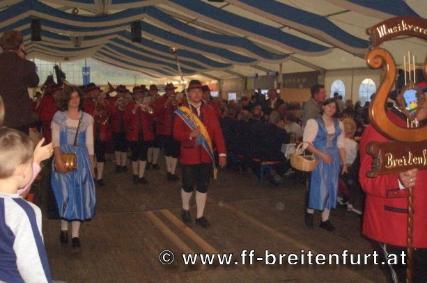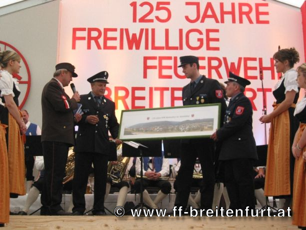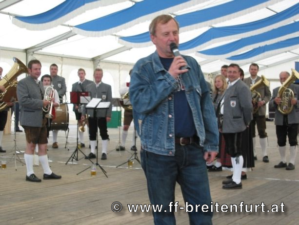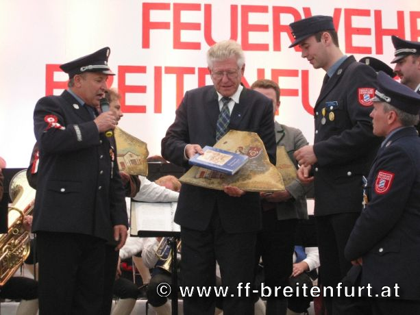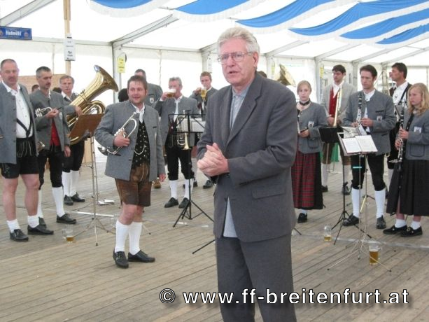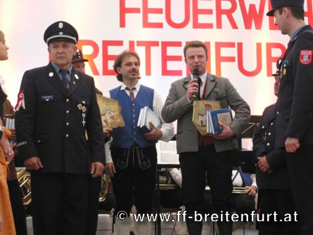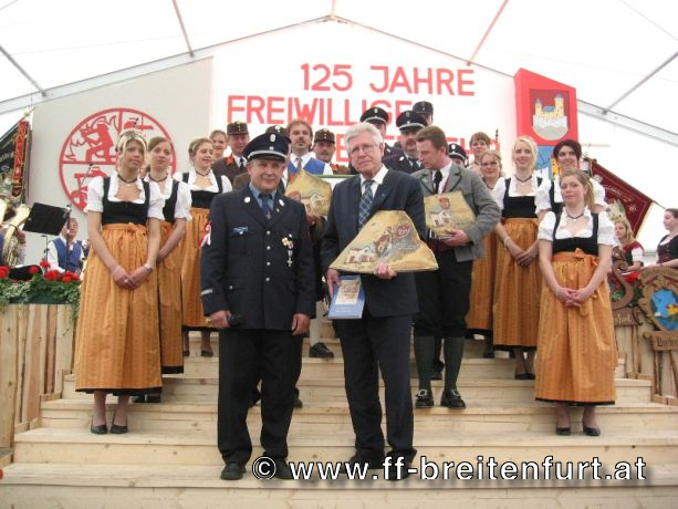 Danach wurde Aufstellung zum Einzug ins Festzelt genommen. Angeführt von den Breitenfurter Bürgermeistern Hans Harrer (1. Schirmherr) und Ernst Herzig (2. Schirmherr) marschierte der Festzug unter Begleitung des Breitenfurter und Dollnsteiner Musikvereines durch Breitenfurt im Altmühltal Richtung Festzelt. Im Zelt angekommen wurde jede Feuerwehr einzeln begrüßt und zum Fahneneinzug aufgerufen. Nachdem alle Vereine eingezogen waren, wurden vom Kreisbrandrat die Ehrungen verdienter Mitglieder vorgenommen. Im Zuge dieses Festaktes wurde HBI Erwin Rautner und OBI Erwin Hofbauer der FF Breitenfurt bei Wien die Medaille für internationale Zusammenarbeit des Deutschen Feuerwehrverbandes verliehen. Als Gastgeschenk überreichte unser Kommandant Erwin Rautner eine von Wolfgang Schöny angefertigte Tafel aus Kirschenholz in welche zwei alte Postkarten, eine aus Breitenfurt im Altmühltal und eine aus Breitenfurt bei Wien eingearbeitet sind übergeben. Die Tafel soll auf die 25 jährige Freundschaft erinnern und wie sich die beiden Breitenfurter Feuerwehren kennen gelernt haben. Als Besonderheit schenkten wir noch ein Feuerwerk und führten eine „Fireshow“ gemeinsam mit den bayrischen Feuerwehrkameraden vor.