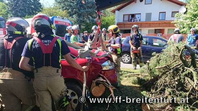 Das zweite, am Grundstück geparkte Fahrzeug, wurde mittels Bergekran von einem abgerissenen Baumstamm gehoben und ebenfalls mittels KLF und ABSCHLEPPACHSE abtransportiert.