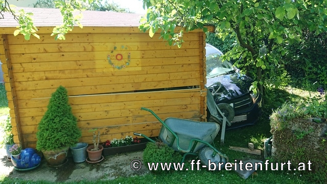 Aus unbekannter Ursache war ein PKW von der Fahrbahn abgekommen, kollidierte mit einem, auf dem Grundstück, abgestellten PKW, durchbrach eine Hecke und kam in weiterer Folge in einem Garten, in einer Gartenhütte, zum Stillstand.