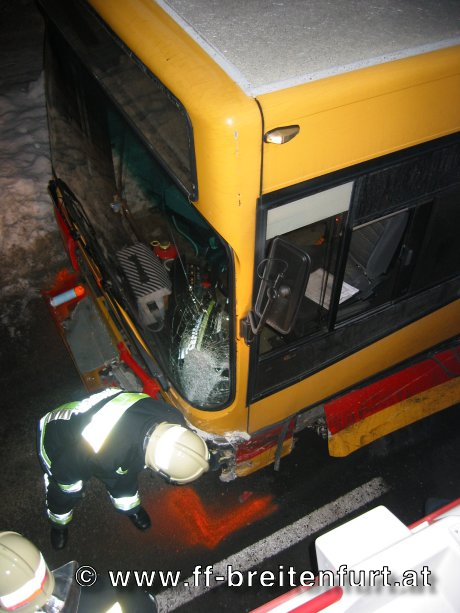 Nach der Unfallaufnahme der Polizei wurde der PKW mittels ABSCHLEPPACHSE und dem KLF entfernt und an einer von der Polizei bezeichneten Stelle gesichert abgestellt. Der Autobus konnte bis zur nächsten Abstellmöglich seine Fahrt selbstständig fortsetzen. Die Fahrbahn wurde provisorisch gereinigt und zwecks weiter Reinigung an den Bauhof übergeben.