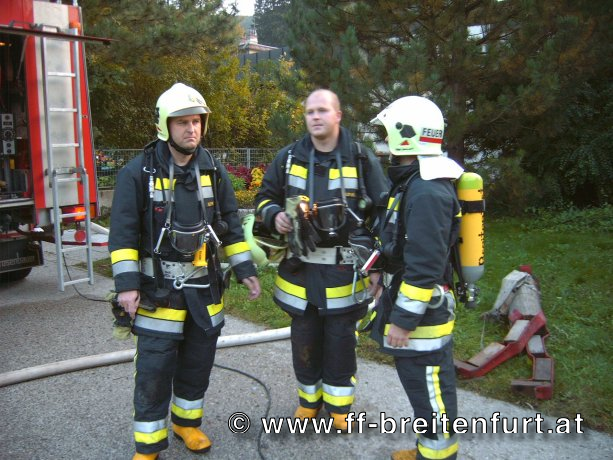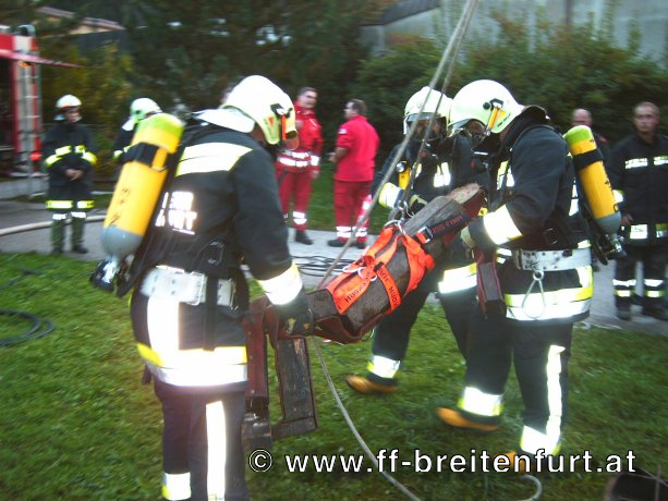 Der erste Trupp, begann mit dem löschen des Brandes, der zweite Atemschutztrupp durchsuchte das Gewölbe nach möglichen Verletzten. Dabei konnte er die erste der drei verletzten Personen bergen. Die verletzte Person wurde sofort dem Rettungsdienst Kaltenleutgeben übergeben.