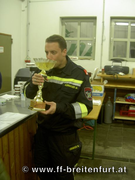 Neben dem Pokal für den 1. Platz erhielten die Breitenfurter Feuerwehrmänner einen Wanderpokal, den es im nächsten Jahr zu verteidigen gilt sowie drei neue Helme (HPS 6100), die von der Firma Dräger gesponsert wurden.