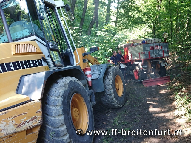 Heute Mittag wurde die Freiwillige Feuerwehr Breitenfurt zur Bergung eines Radladers alarmiert. Das rund 8 Tonnen schwere Fahrzeuge war von einer Forststraße abgerutscht und drohte eine Böschung hinab zu stürzen.