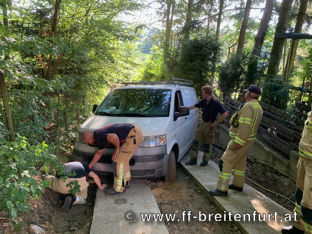 Da eine Bergung mittels Feuerwehrauto und Seilwinde nicht möglich war, musste eine Freilandverankerung geschlagen werden. Mit dem an der Freilandverankerung befestigten Greifzug wurde das Fahrzeug angeschlagen und im direkten Zug zurück auf die betonierte Zufahrtsrampe gezogen. Danach wurde der VW Bus gesichert auf die Straße abgelassen und dem Besitzer unbeschädigt übergeben.