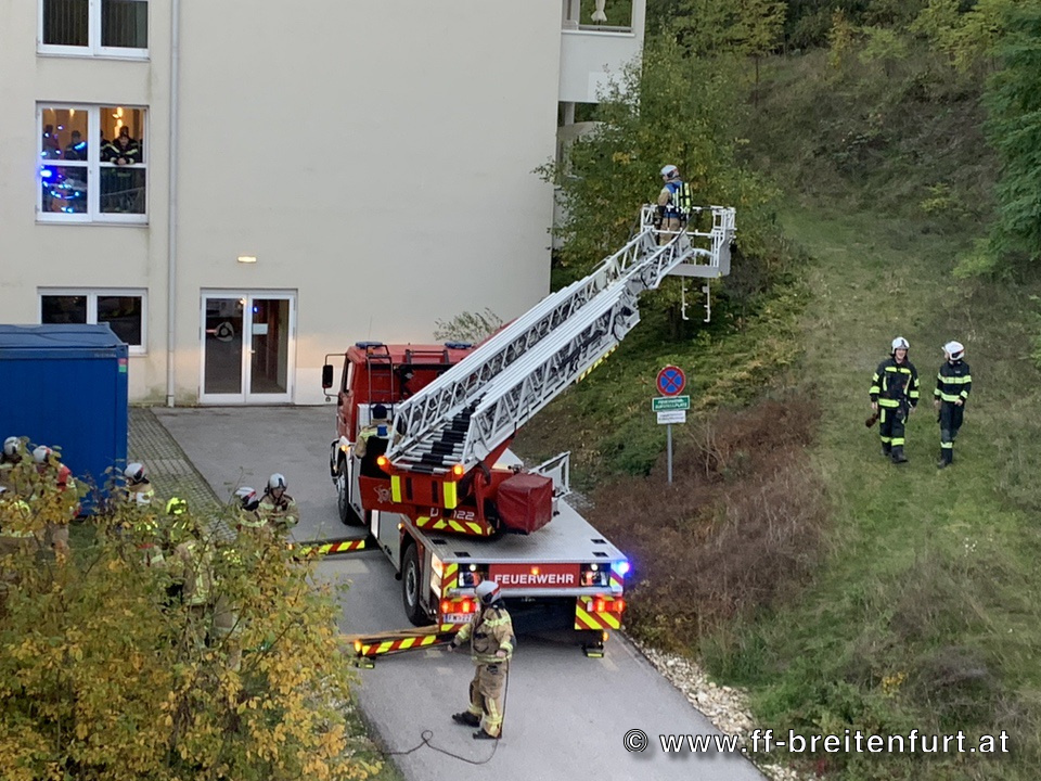 An der Rückseite des Gebäudes mussten mehrere Personen über Fenster aus ihren Zimmern befreit werden. Diese Rettungen erfolgten mit Unterstützung der DREHLEITER.