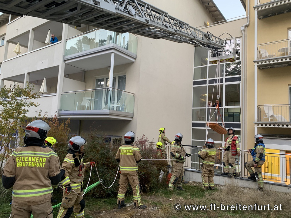 Gemeinsam mit der FF Laab im Walde führte die Mannschaft der DREHLEITER und des TANK 1 eine Personenrettung aus einem tiefergelegenen Vorplatz durch. Dabei kam eine Korbschleiftrage in Verbindung mit dem Kendler-Flaschenzug über die DREHLEITER zum Einsatz.