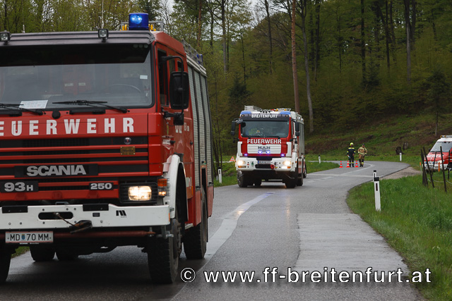 Aufgrund des Alarmplan für diese Einsatzart wurde die Freiwillige Feuerwehr Breitenfurt ebenfalls mittels Sirene alarmiert und rückte nach wenigen Minuten mit vier Fahrzeugen zum Einsatz aus.