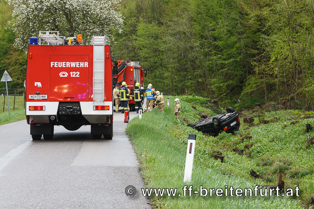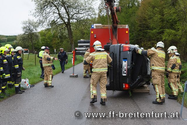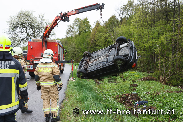 Die Mannschaft der FF Breitenfurt unterstütze die Kameraden der FF Sulz bei der Absicherung der Unfallstelle. Nach der Unfallaufnahme, durch die anwesende Polizei wurde der am Dach, im Straßengraben, liegende PKW wurde mittels Kran des SRF geborgen und der FF Sulz im Wienerwald zum Abtransport übergeben.