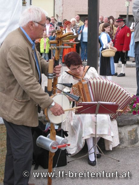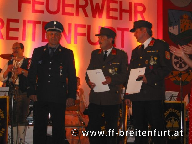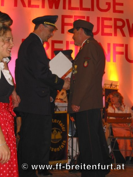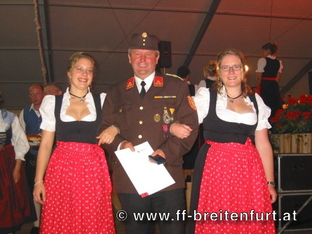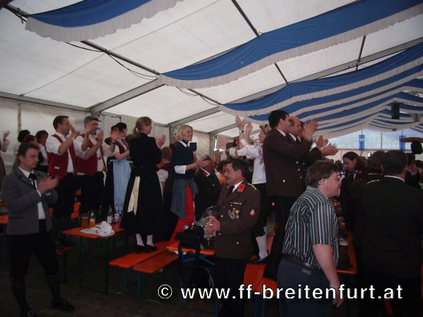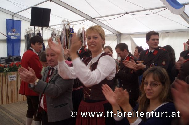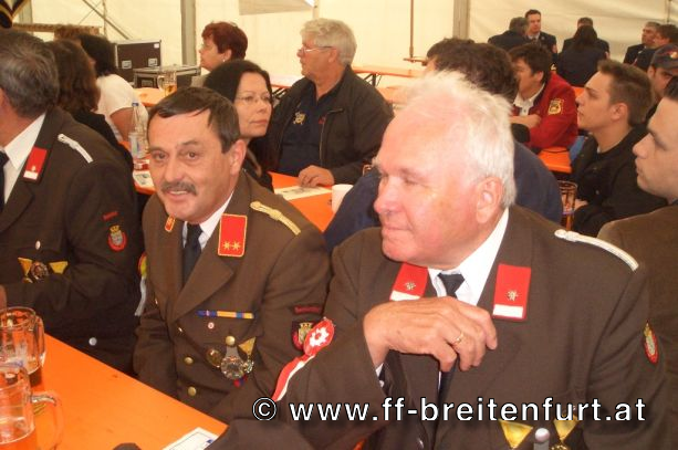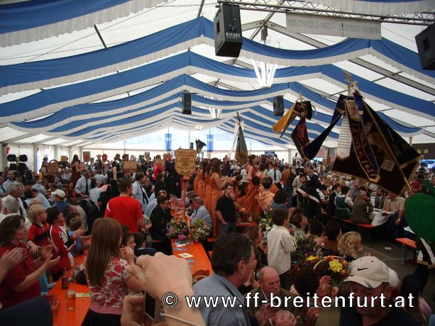 Danach wurde Aufstellung zum Einzug ins Festzelt genommen. Angeführt von den Breitenfurter Bürgermeistern Hans Harrer (1. Schirmherr) und Ernst Herzig (2. Schirmherr) marschierte der Festzug unter Begleitung des Breitenfurter und Dollnsteiner Musikvereines durch Breitenfurt im Altmühltal Richtung Festzelt. Im Zelt angekommen wurde jede Feuerwehr einzeln begrüßt und zum Fahneneinzug aufgerufen. Nachdem alle Vereine eingezogen waren, wurden vom Kreisbrandrat die Ehrungen verdienter Mitglieder vorgenommen. Im Zuge dieses Festaktes wurde HBI Erwin Rautner und OBI Erwin Hofbauer der FF Breitenfurt bei Wien die Medaille für internationale Zusammenarbeit des Deutschen Feuerwehrverbandes verliehen. Als Gastgeschenk überreichte unser Kommandant Erwin Rautner eine von Wolfgang Schöny angefertigte Tafel aus Kirschenholz in welche zwei alte Postkarten, eine aus Breitenfurt im Altmühltal und eine aus Breitenfurt bei Wien eingearbeitet sind übergeben. Die Tafel soll auf die 25 jährige Freundschaft erinnern und wie sich die beiden Breitenfurter Feuerwehren kennen gelernt haben. Als Besonderheit schenkten wir noch ein Feuerwerk und führten eine „Fireshow“ gemeinsam mit den bayrischen Feuerwehrkameraden vor.